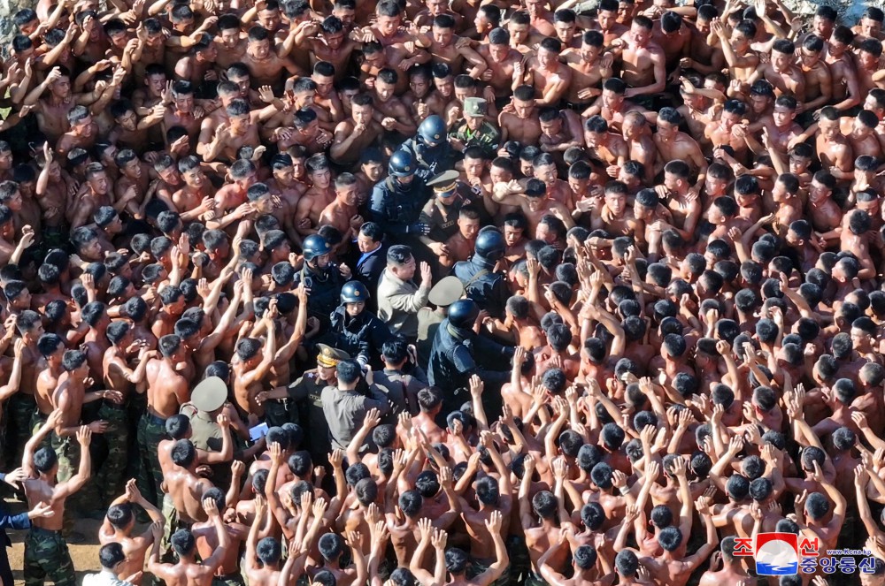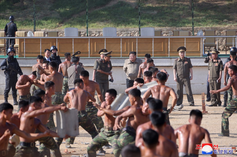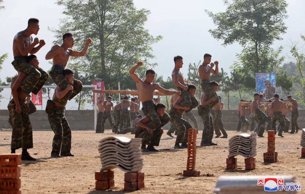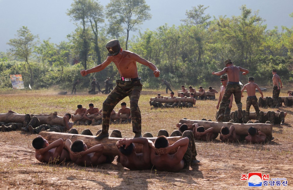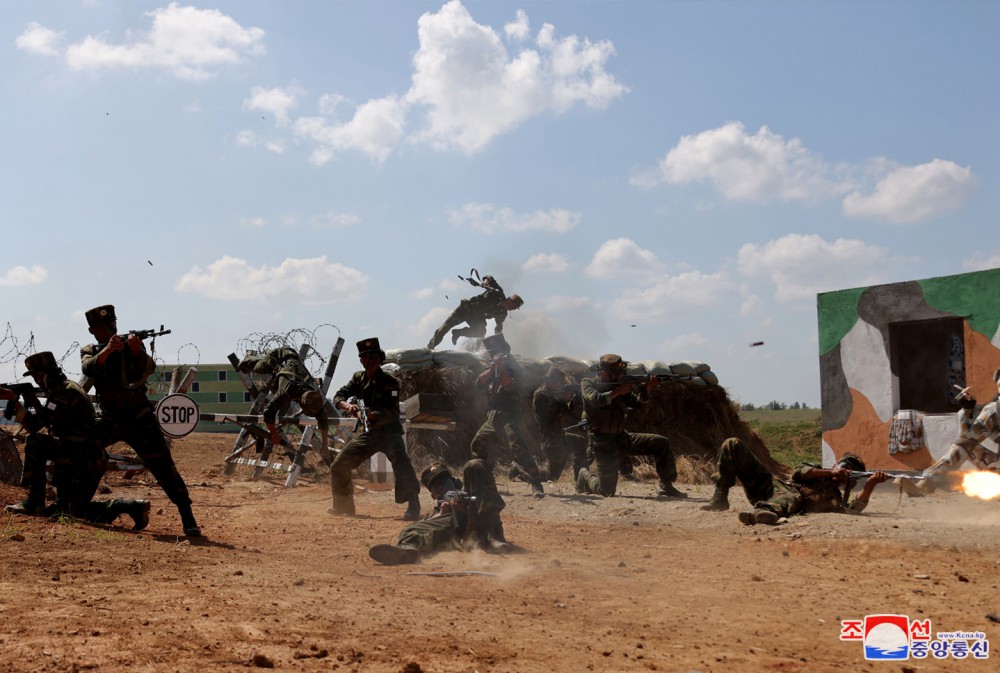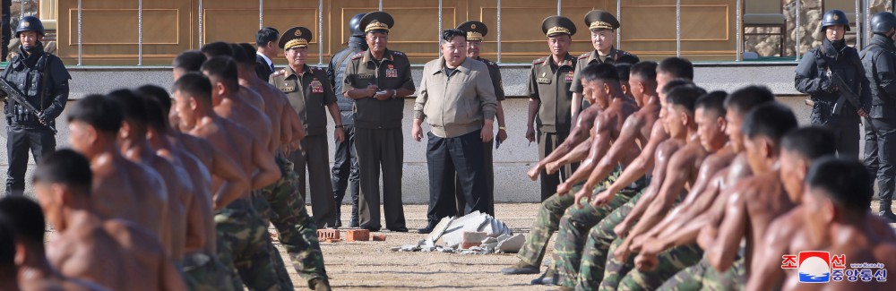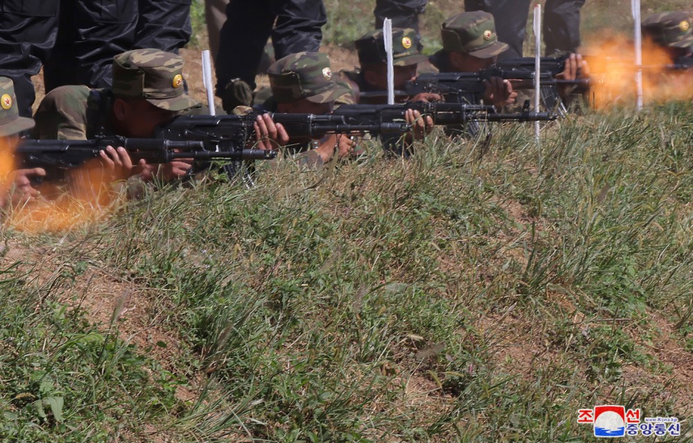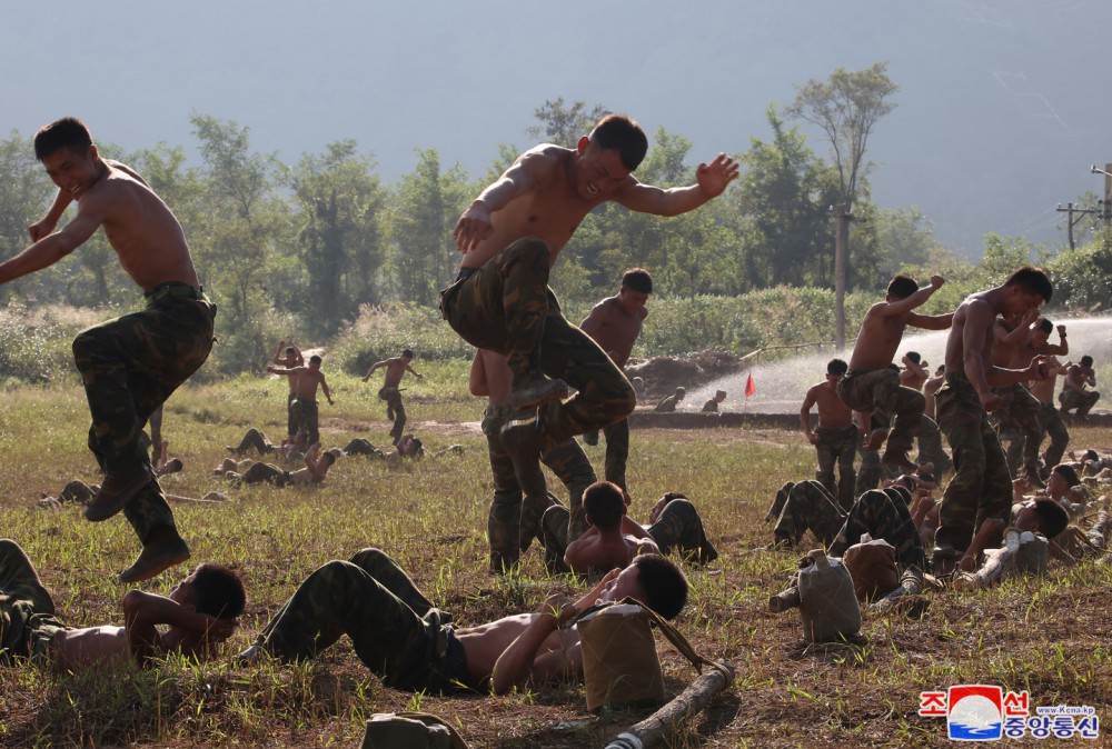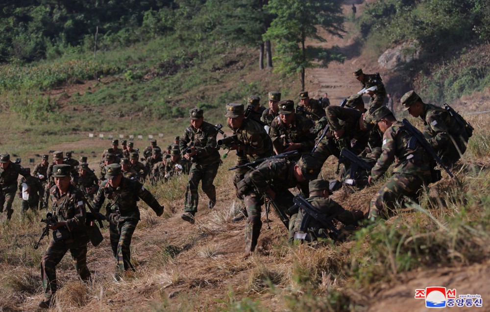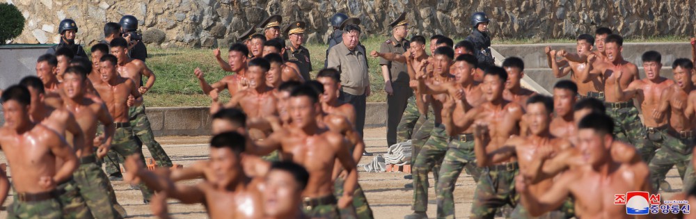 金正恩同志滿(mǎn)意地望著(zhù)軍人們精通主體的現代戰法,在訓練場(chǎng)上龍騰虎躍的情景,高度贊賞,全體戰斗員都身強力壯、驍勇善戰,切實(shí)保持高度的臨戰態(tài)勢,在高強度革命訓練熔爐中鍛煉成為以一當百的戰斗員。