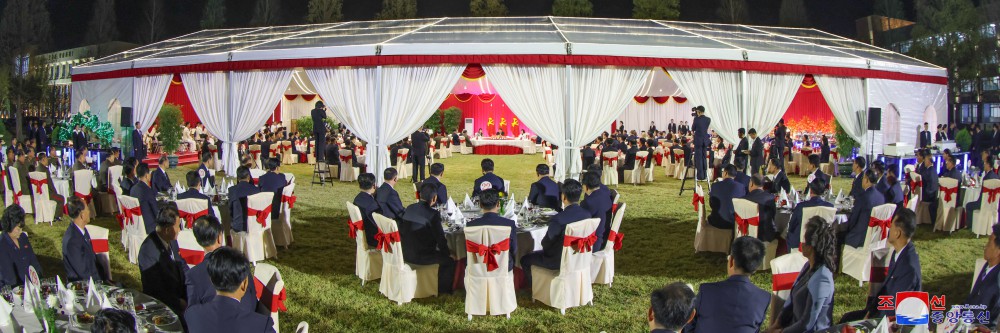 宴會(huì )場(chǎng)所洋溢著(zhù)全體參加者在保證百戰百勝的朝鮮勞動(dòng)黨千萬(wàn)年未來(lái)的強有力的堡壘、革命的圣地慶祝史意深遠的我們黨執政79周年的激情和喜悅。