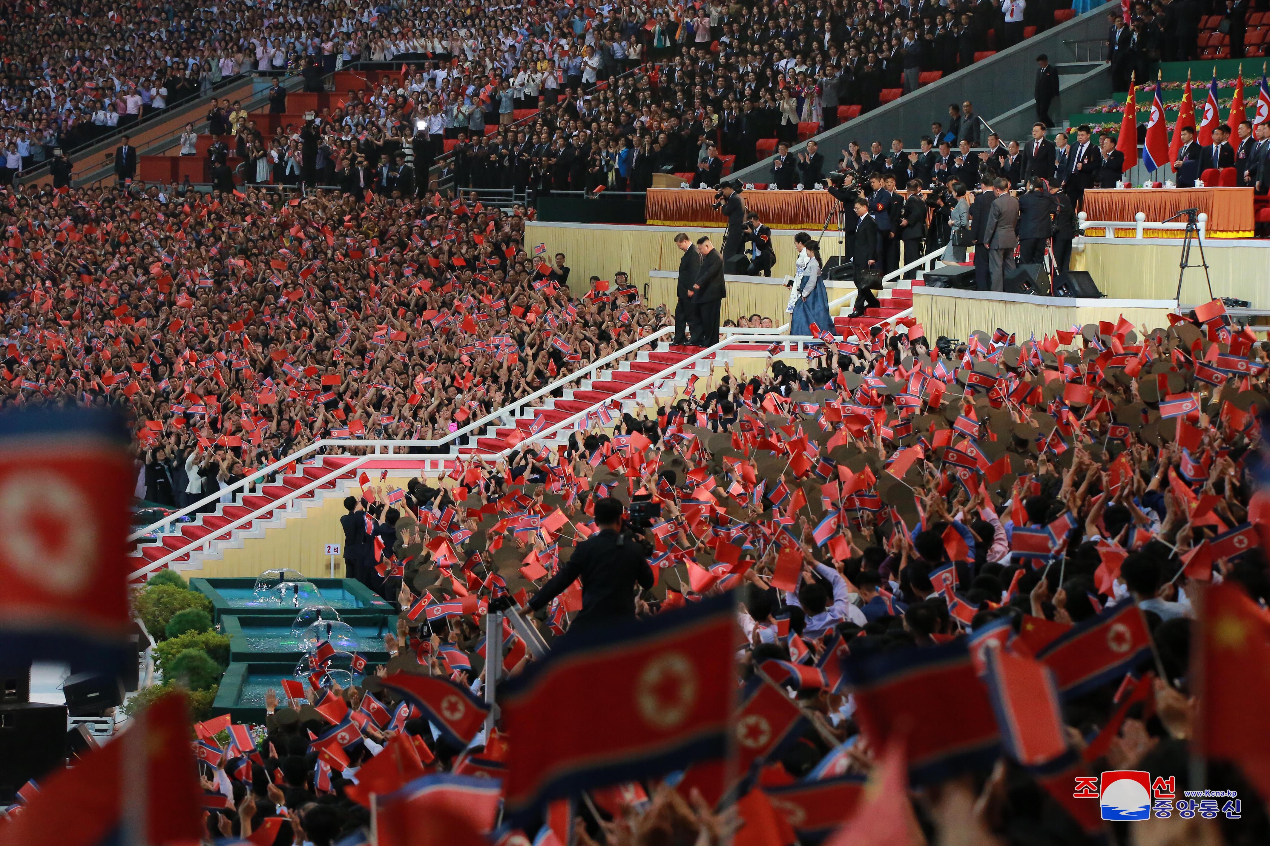 當晚,能容納10萬(wàn)余人的“五一”體育場(chǎng)座無(wú)虛席?!盁崃覛g迎習近平總書(shū)記同志和彭麗媛女士”“平壤-北京”等標語(yǔ)格外醒目。當地時(shí)間晚9時(shí)40分許,習近平和夫人彭麗媛在金正恩和夫人李雪主陪同下,來(lái)到體育場(chǎng)主席臺。在場(chǎng)觀(guān)眾全體起立,以熱烈的掌聲和歡呼聲,歡迎中國貴賓的到來(lái)。