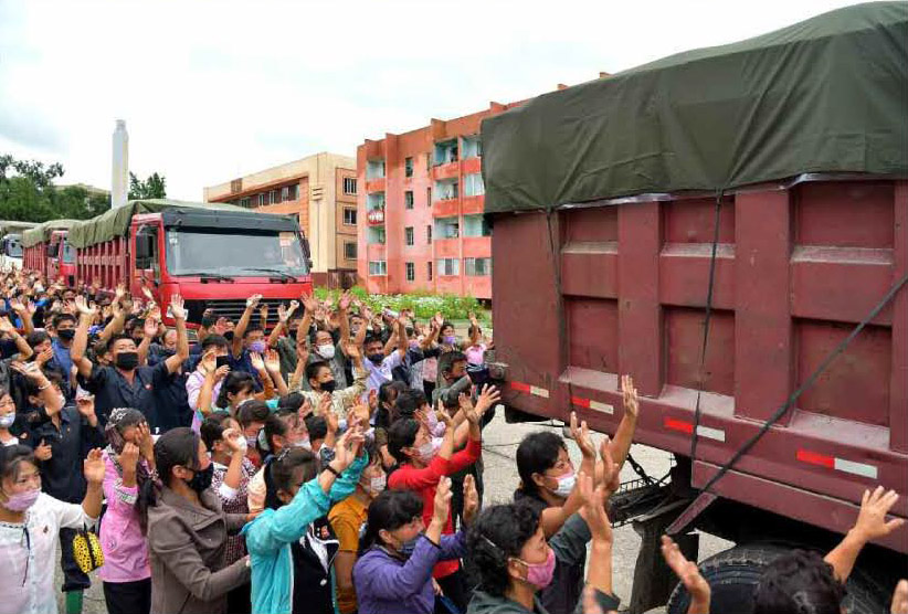 金正恩總書(shū)記把糧食發(fā)給黃海北道銀波郡災民,人們在迎接滿(mǎn)載糧食的車(chē)輛。(2020年)
