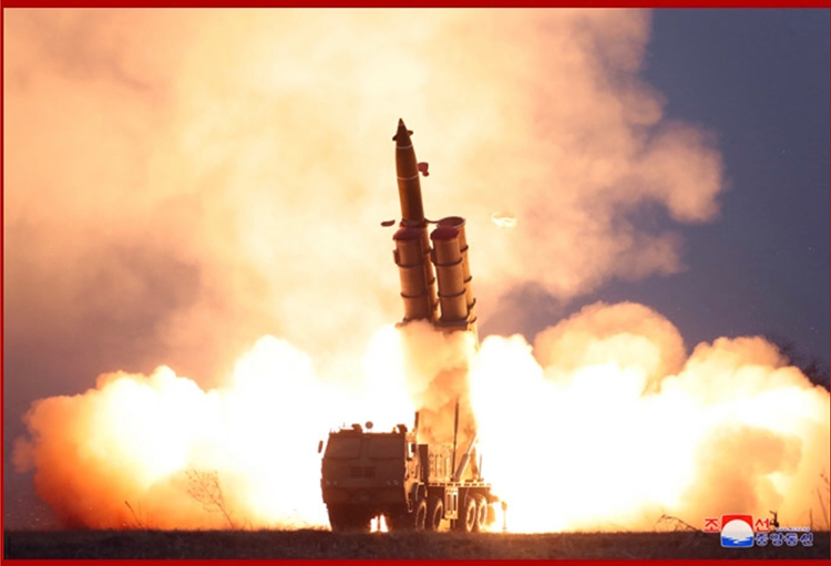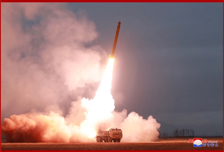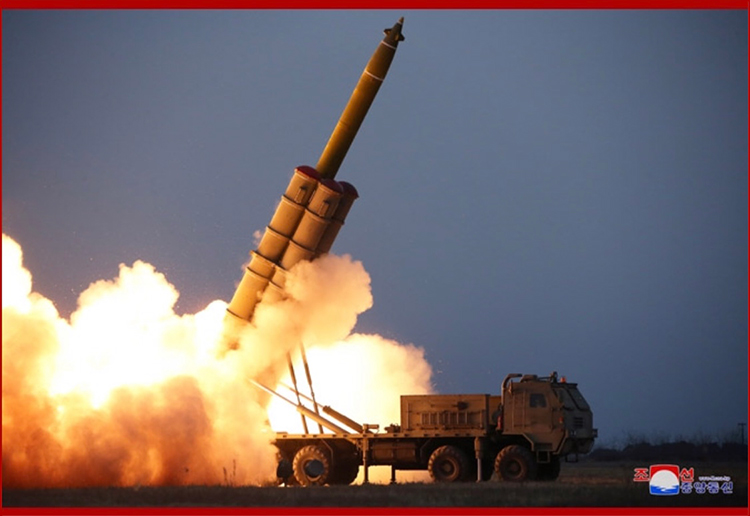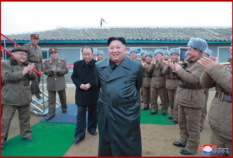 朝鮮人民軍總參謀長(cháng)樸正天陸軍大將和人民軍大聯(lián)合部隊首長(cháng)們一同觀(guān)摩超大型火箭炮試射。