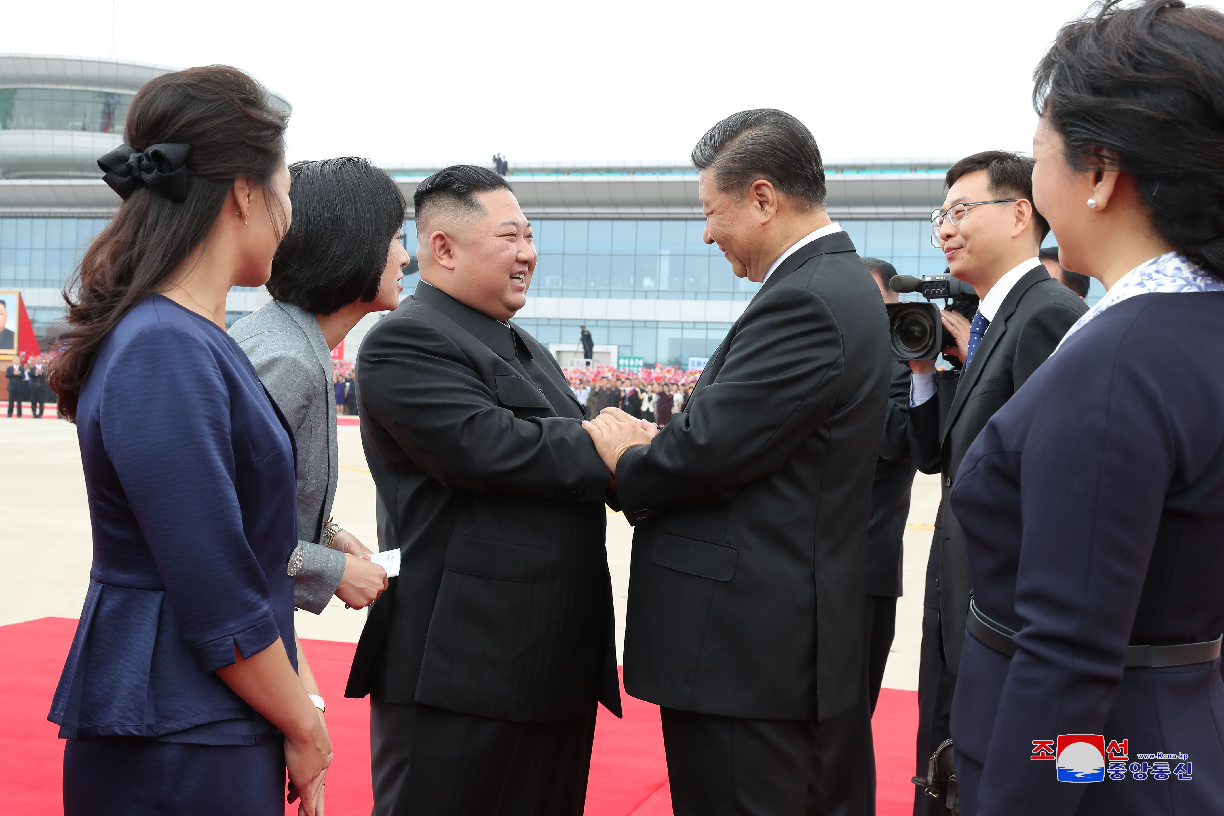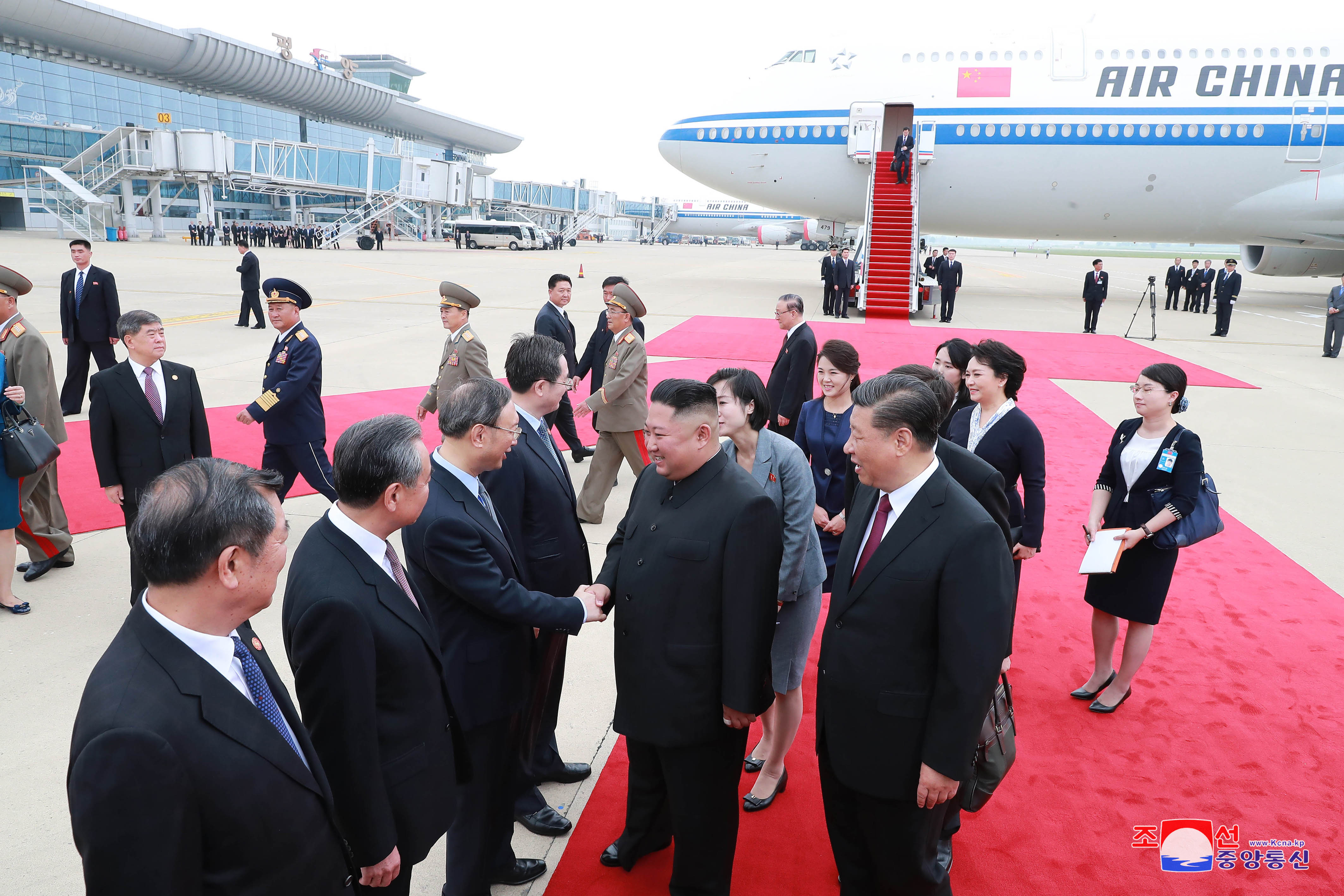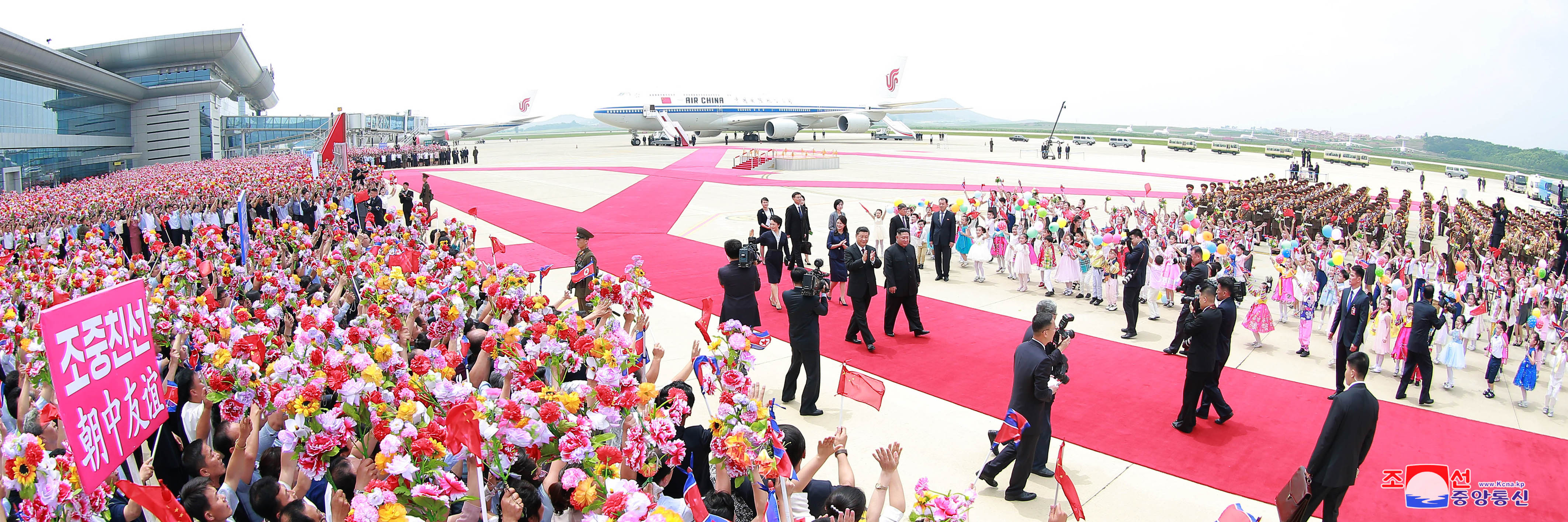 在朝鮮群眾浪潮般的歡呼聲中,習近平和夫人彭麗媛步出艙門(mén),金正恩和夫人李雪主在舷梯旁熱情迎接。習近平走下舷梯,同金正恩親切握手問(wèn)候。朝鮮兒童向習近平和彭麗媛獻上鮮花。習近平主席并同前來(lái)迎接的朝方高級官員一一握手致意。