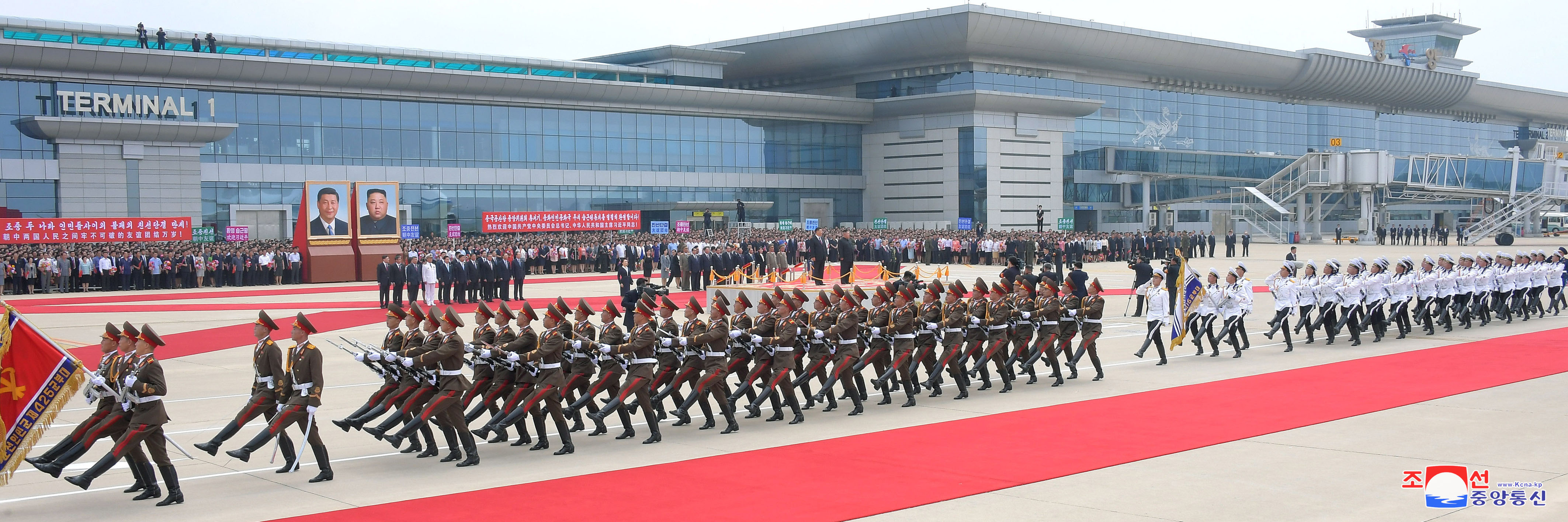 朝鮮黨和國家領(lǐng)導人樸鳳柱、李勇浩、李萬(wàn)建、李洙墉、崔輝、金英哲、金秀吉、李永吉、努光鐵、李龍男、金與正等參加機場(chǎng)歡迎儀式。