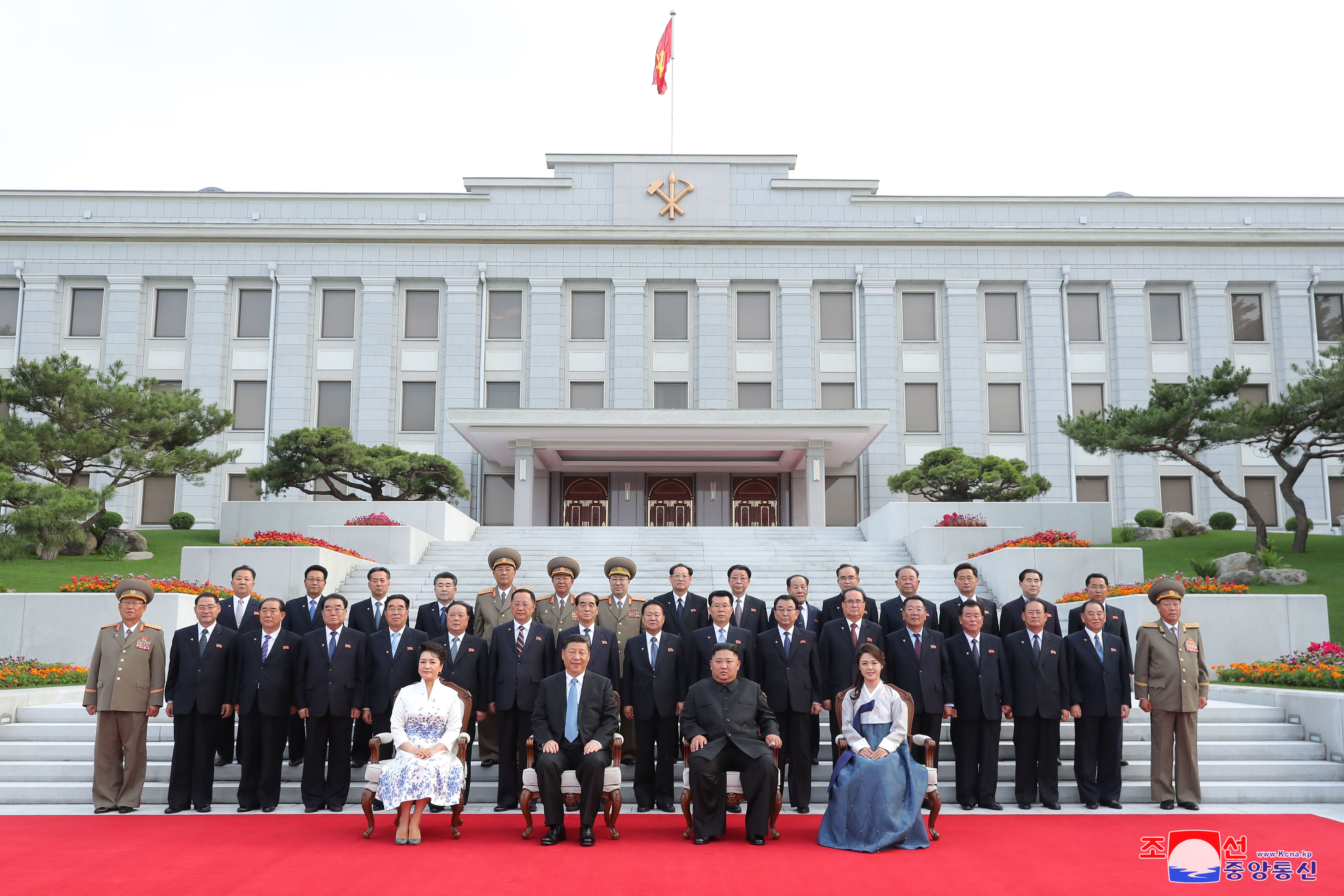 宴會(huì )前,習近平在朝鮮勞動(dòng)黨中央本部接受朝鮮勞動(dòng)黨中央全體政治局委員和候補委員致敬。黨中央科技部長(cháng)、群眾團體部長(cháng)向習近平總書(shū)記夫婦獻花。在熱烈友好的氣氛中,習近平總書(shū)記夫婦和金正恩委員長(cháng)夫婦同大家合影留念。