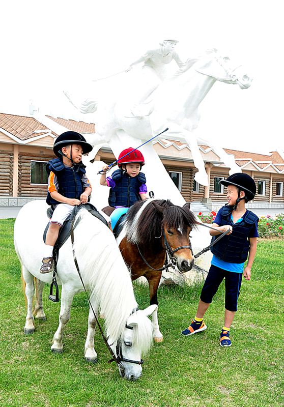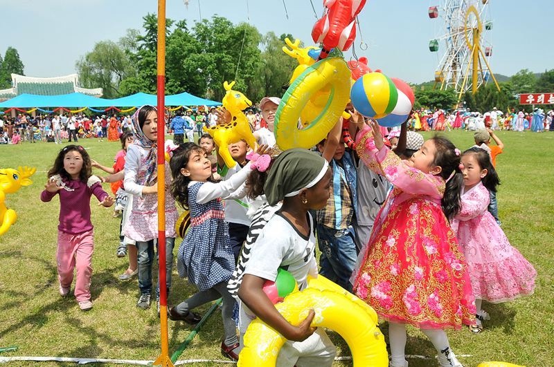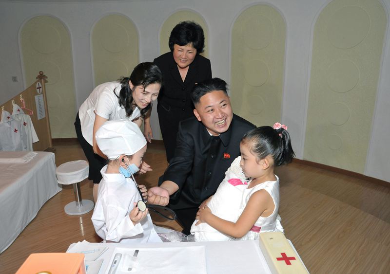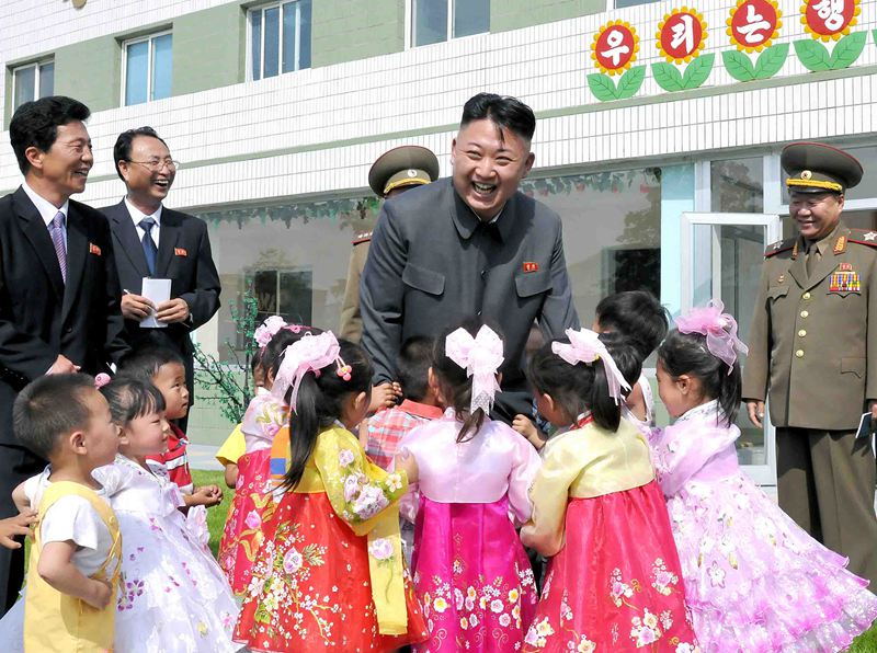 敬愛(ài)的最高領(lǐng)導者金正恩同志和幼兒園兒童在一起。2013年6月
