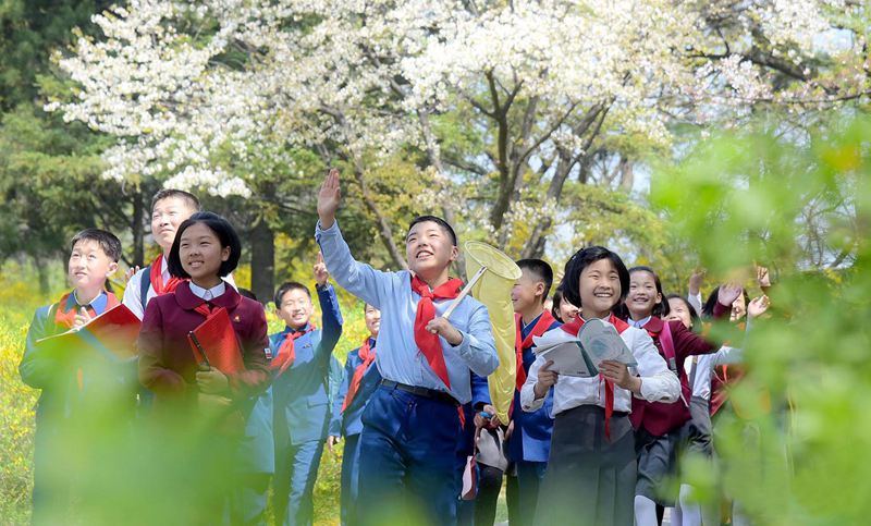 敬愛(ài)的最高領(lǐng)導者金正恩同志和學(xué)生少年們在一起。2017年6月