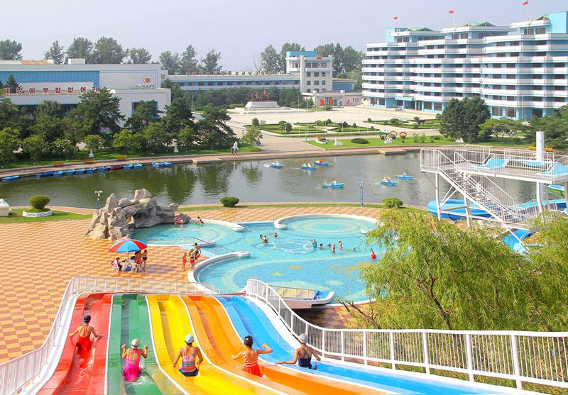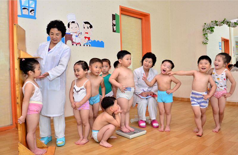 敬愛(ài)的最高領(lǐng)導者金正恩同志視察慶上幼兒園。2012年7月