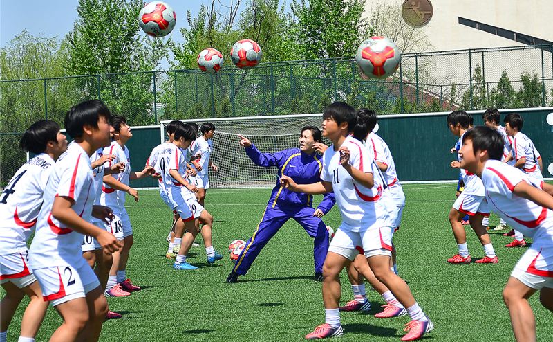 敬愛(ài)的最高領(lǐng)導者金正恩同志和少年足球選手在一起。2014年5月