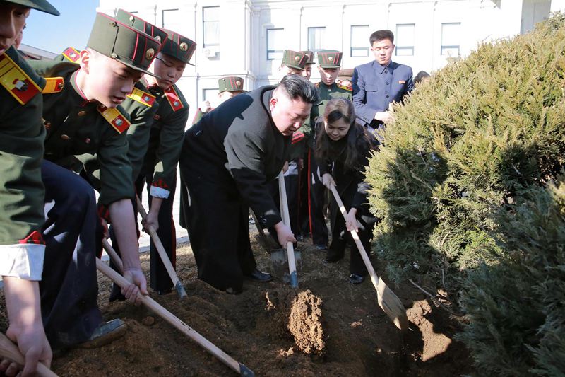 敬愛(ài)的最高領(lǐng)導者金正恩同志和萬(wàn)景臺革命學(xué)院學(xué)員們一起種植樹(shù)木。2017年3月
