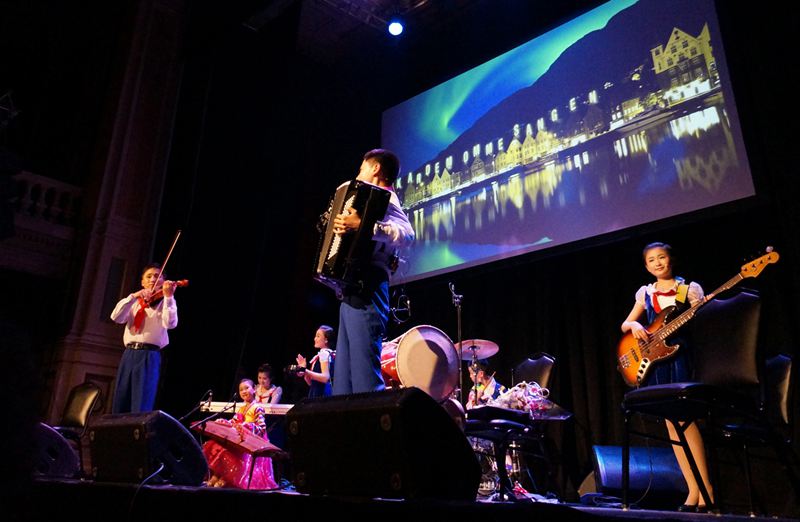 朝鮮學(xué)生藝術(shù)團參加在挪威進(jìn)行的卑爾根國際音樂(lè )節,受到觀(guān)眾熱烈喝彩。2014年5月