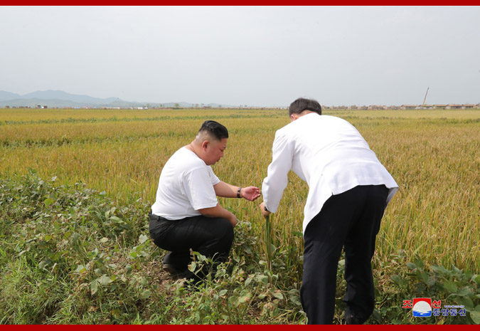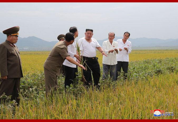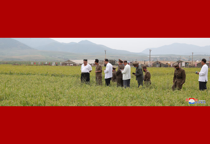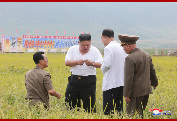 金正恩來(lái)到漬澇稻田具體了解農作物的生育狀態(tài),并就在不少田地的漬澇稻田發(fā)生各種疾病,水稻的生育狀態(tài)不那么理想表示深切憂(yōu)慮。