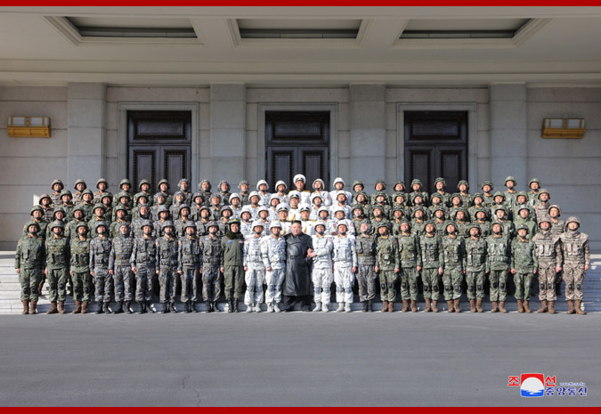 敬愛(ài)的金正恩同志表示相信,我國革命武裝力量將盡到作為銅墻鐵壁般地保衛祖國和人民的國家防衛的主體、真正的人民軍隊的使命和本分,并同閱兵式參加人員一起合影留念。