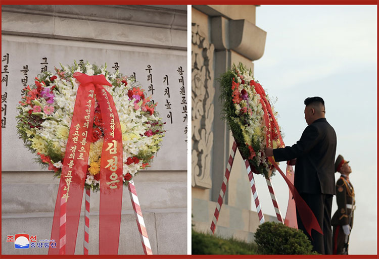 伴隨著(zhù)《獻花曲》響起,敬愛(ài)的總書(shū)記同志名義的花圈敬獻在友誼塔前。