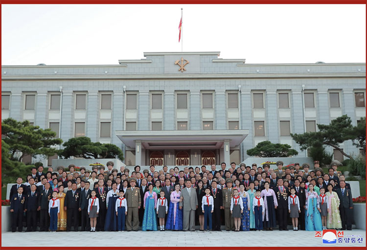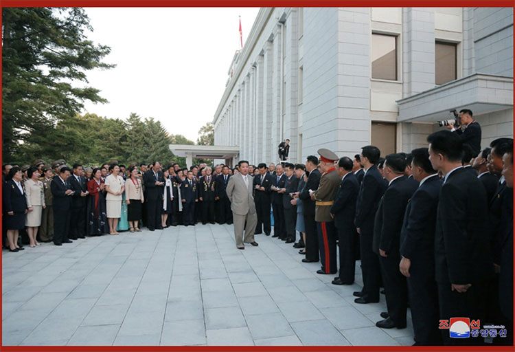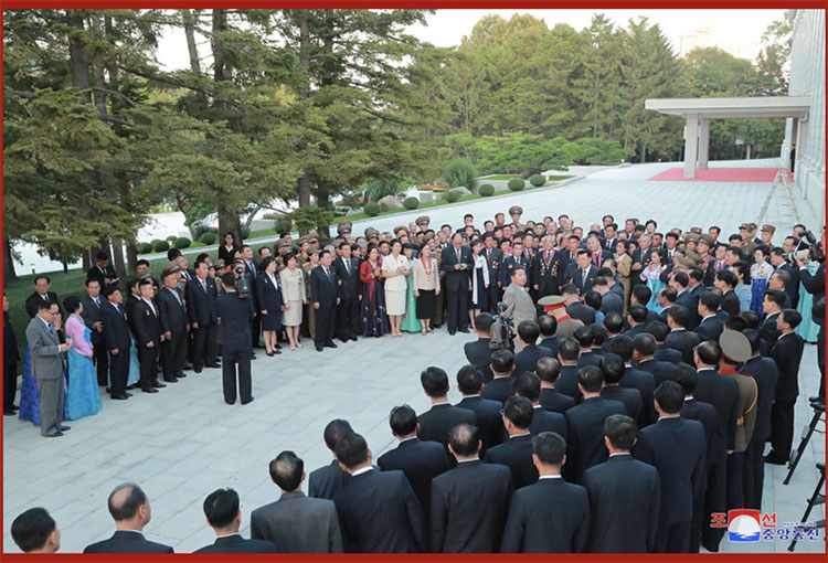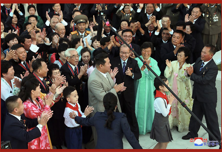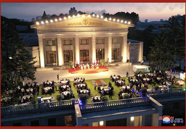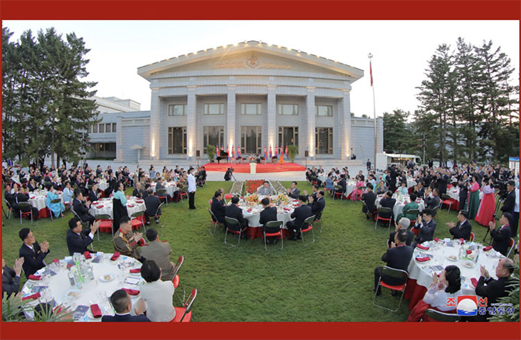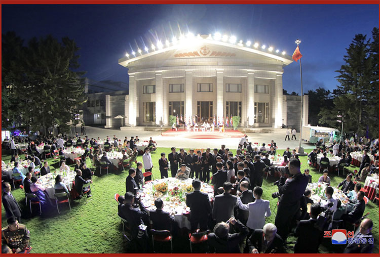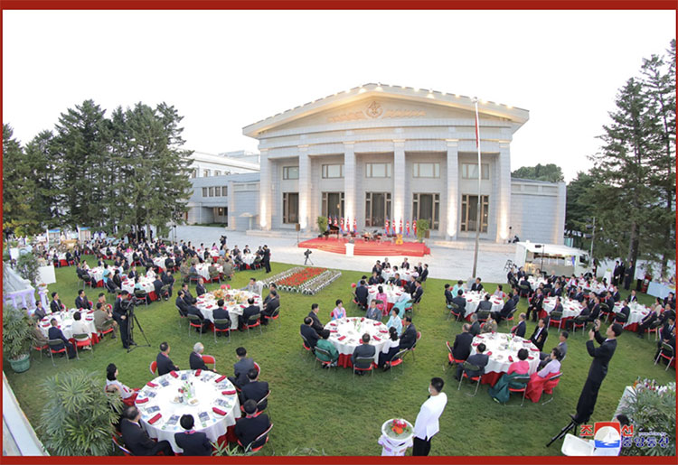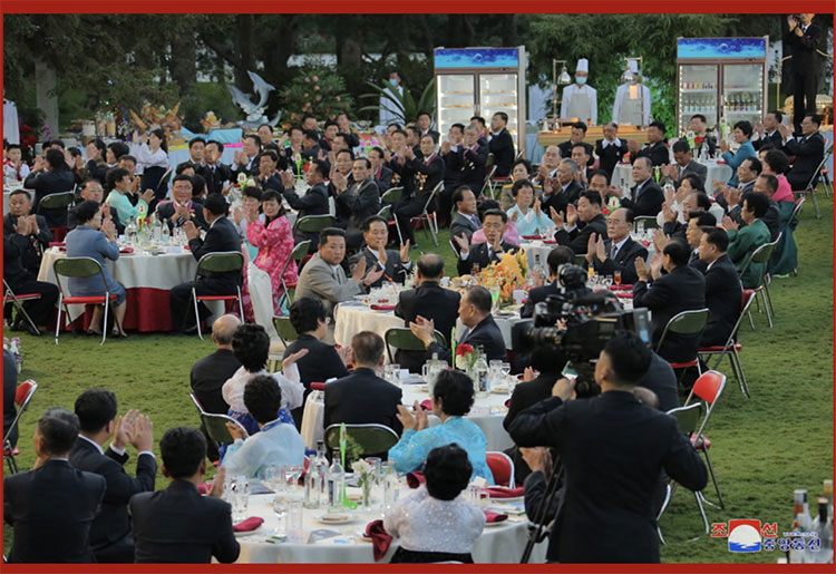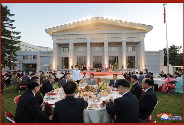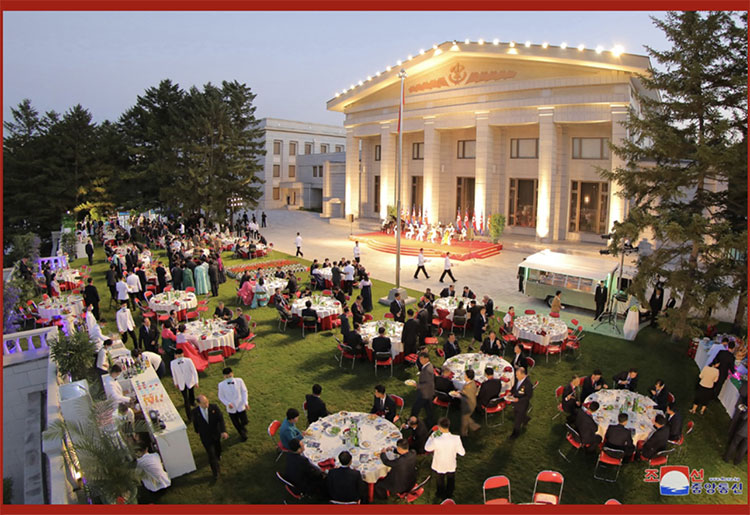 合影結束后,在敬愛(ài)的金正恩同志的出席下,在黨中央本部大樓庭院隆重舉行了慶祝宴會(huì )。