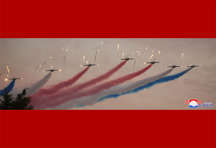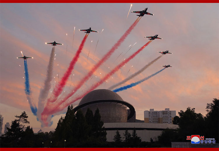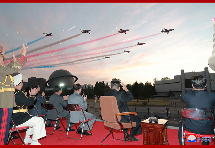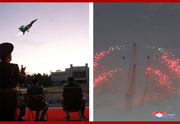 總書(shū)記同志同國防科學(xué)部門(mén)的負責干部一起合影,以紀念在我們黨和祖國歷史上值得大書(shū)特書(shū)的國防發(fā)展展覽會(huì )。接著(zhù),還同出色完成特技飛行表演和跳傘降落任務(wù)的朝鮮人民軍航空與防空軍傘兵和戰斗飛行員一起合影留念。