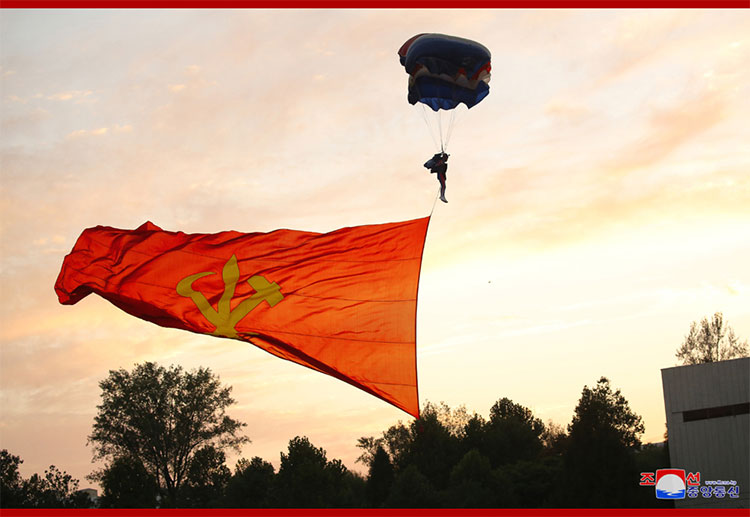 最優(yōu)秀傘兵在充滿(mǎn)歡喜的10月的天空飄揚著(zhù)紅色黨旗進(jìn)行跳傘降落特技表演。
