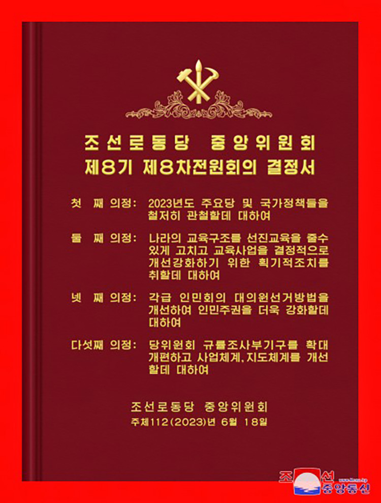朝鮮勞動(dòng)黨第八屆中央委員會(huì )第八次全體會(huì )議擴大會(huì )議于主體112(2023)年6月16日至18日在我國革命的最高參謀部——黨中央委員會(huì )本部舉行,大大提振了全黨和全體人民要以繼續前進(jìn)、連續跳躍鞏固跟隨偉大的黨中央果敢排除萬(wàn)難所爭取的高貴勝利、強大的我們國家尊嚴和地位的戰斗氣勢。
