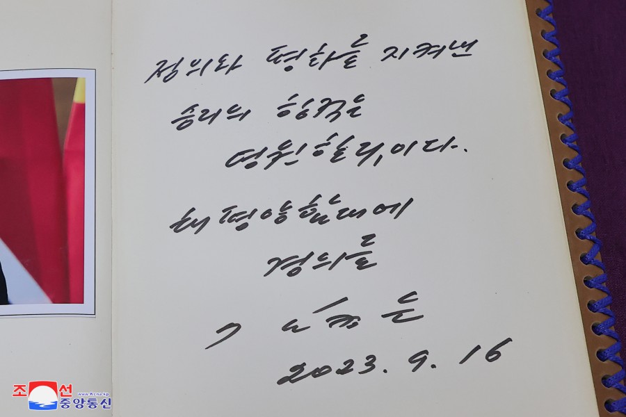 敬愛(ài)的金正恩同志對太平洋艦隊官兵發(fā)揚英勇戰斗精神和英雄精神,為東北亞乃至世界的和平與安全作出重大貢獻予以高度評價(jià)后,轉達禮物做個(gè)參觀(guān)紀念,并在留言簿上親筆留言:“守住正義與和平的勝利航跡永垂不朽。向太平洋艦隊致敬 金正恩?。玻埃玻常梗保丁?。