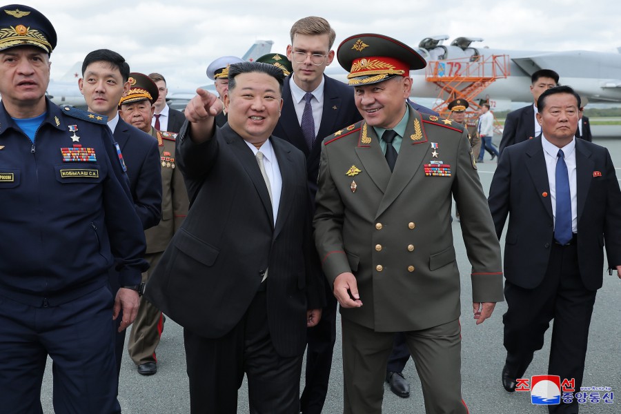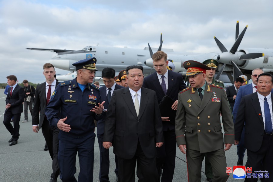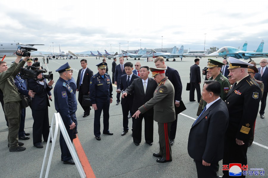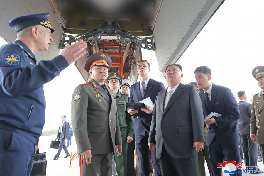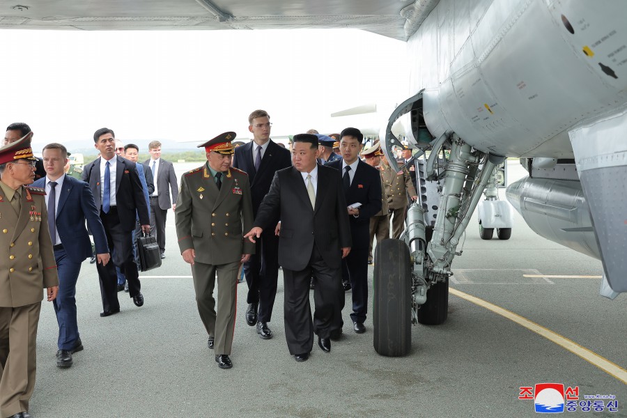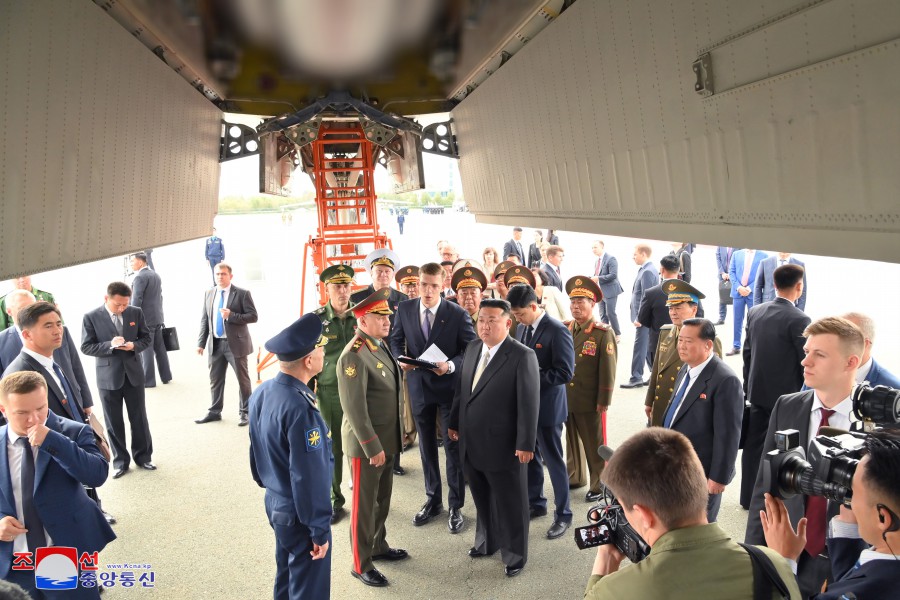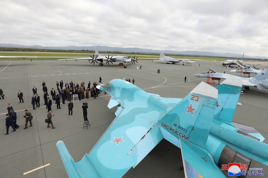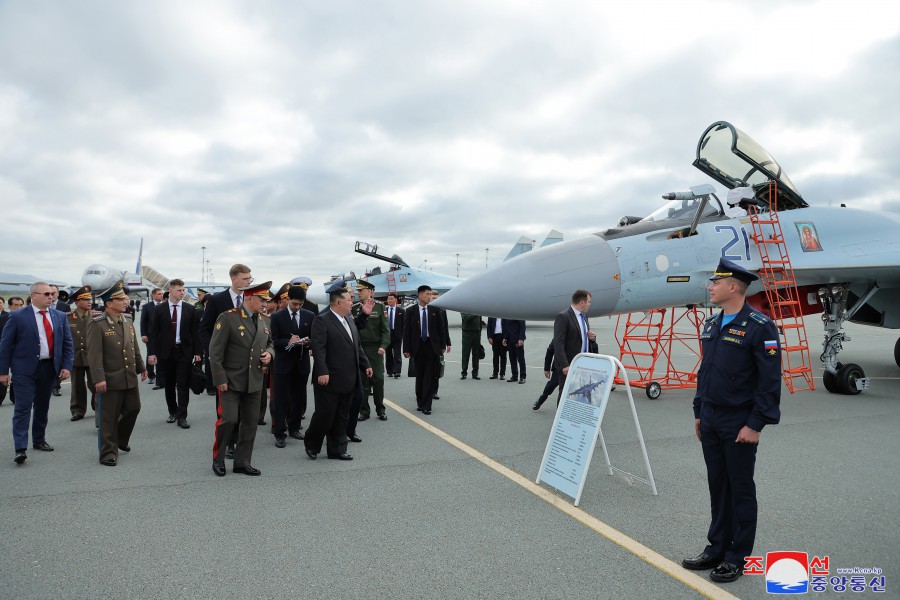 金正恩同志察看軍用飛機,聽(tīng)取有關(guān)戰術(shù)技術(shù)數據的講解,了解戰斗性能和搭載的航空武器裝備,并同俄羅斯軍隊指揮人員進(jìn)行了交談。