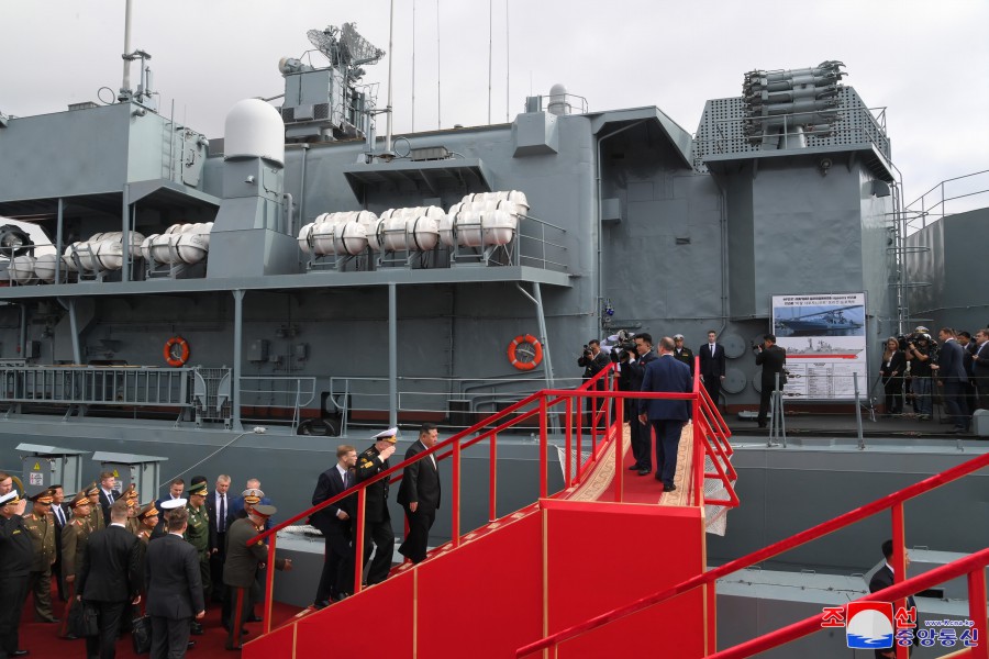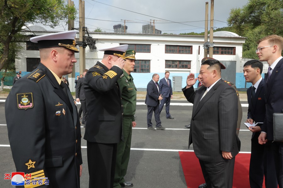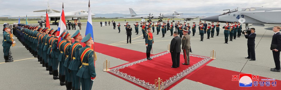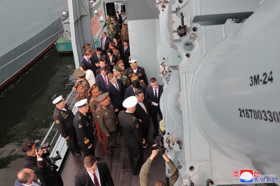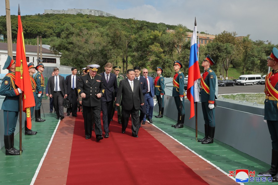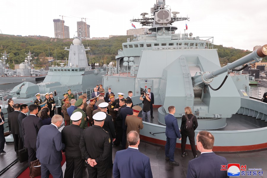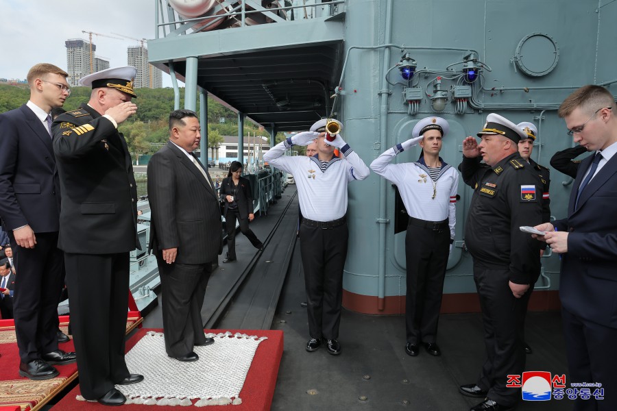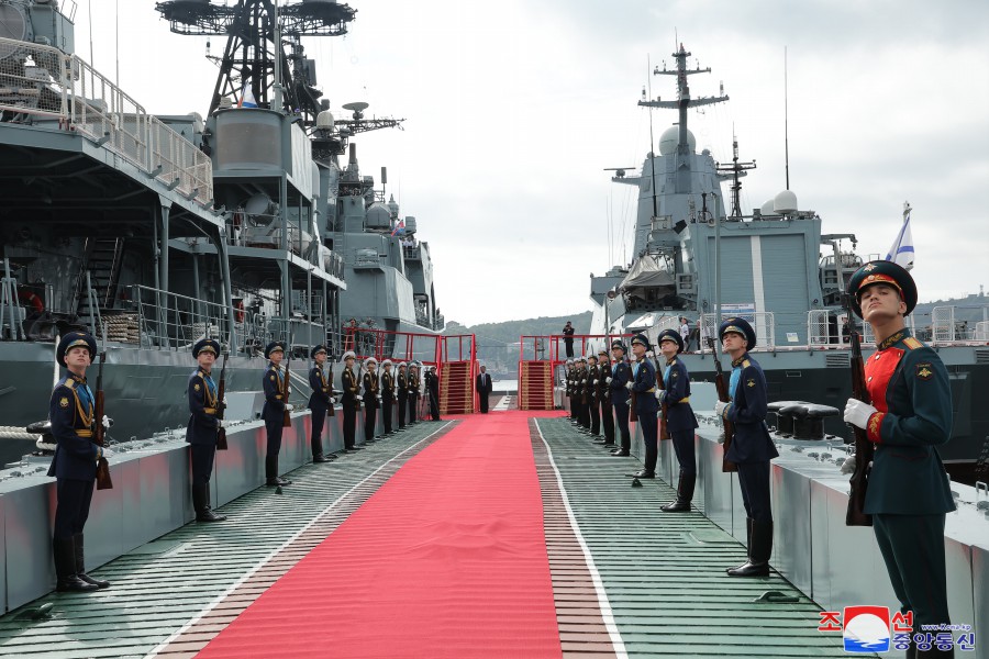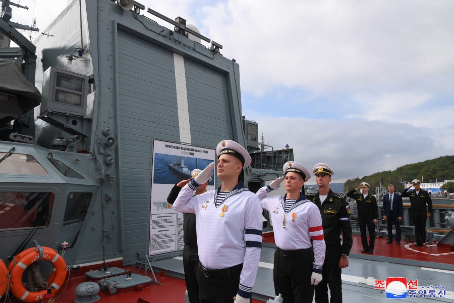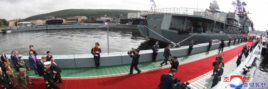 金正恩同志與前來(lái)迎接的海軍指揮官互致問(wèn)候,并接受俄羅斯聯(lián)邦武裝力量陸??哲妰x仗隊隊員和太平洋艦隊儀仗隊隊員的敬意,登上了護衛艦“沙波什尼科夫元帥”號。