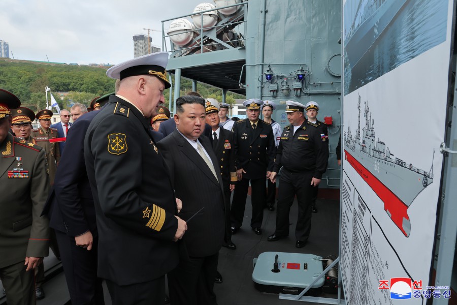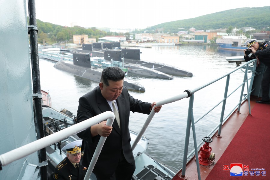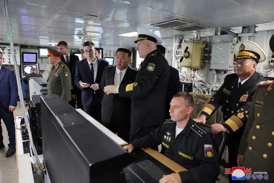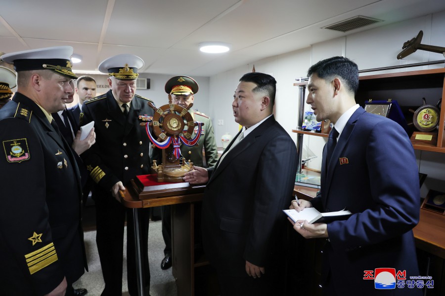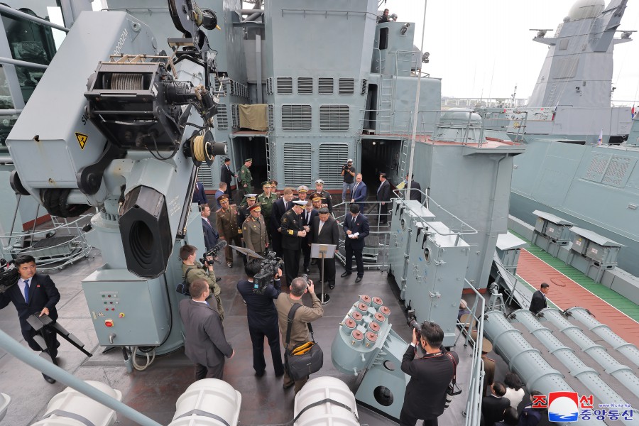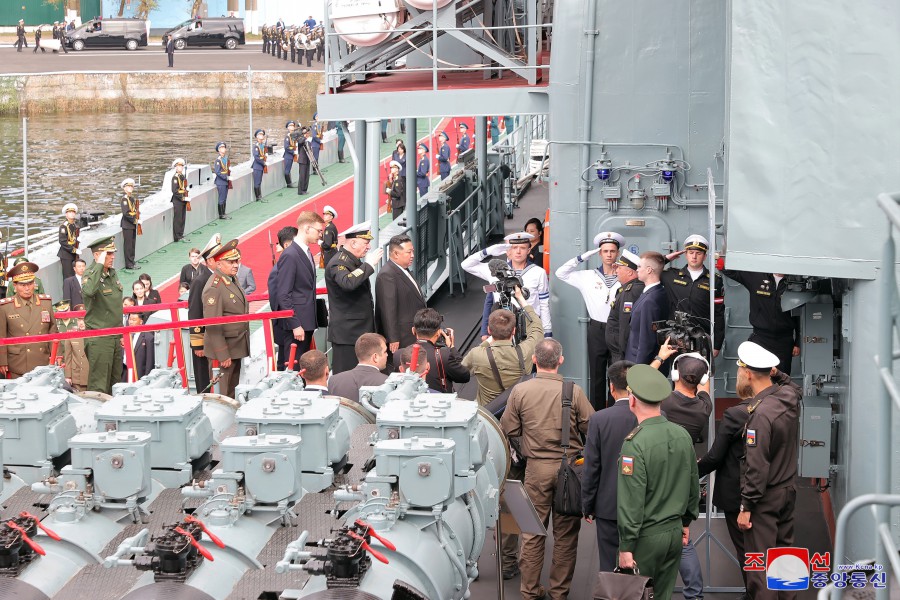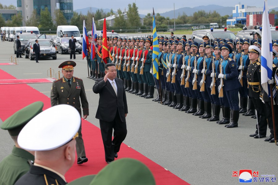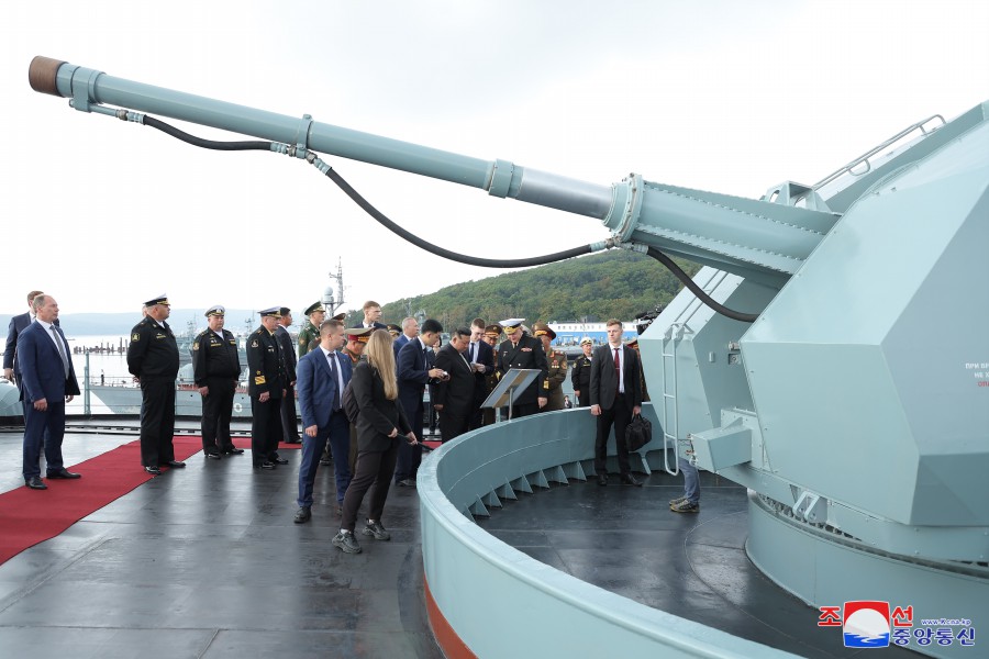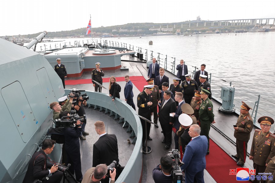 金正恩同志與前來(lái)迎接的海軍指揮官互致問(wèn)候,并接受俄羅斯聯(lián)邦武裝力量陸??哲妰x仗隊隊員和太平洋艦隊儀仗隊隊員的敬意,登上了護衛艦“沙波什尼科夫元帥”號。