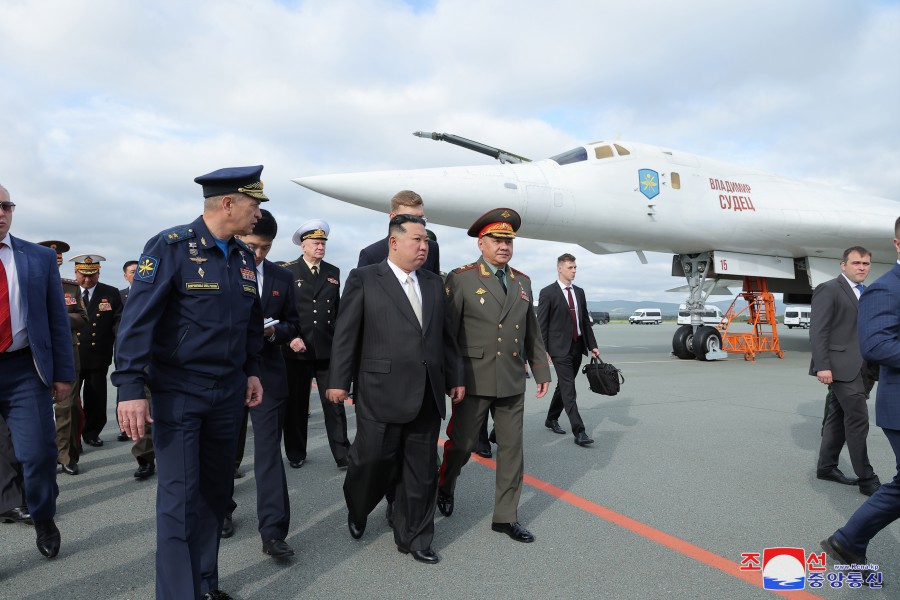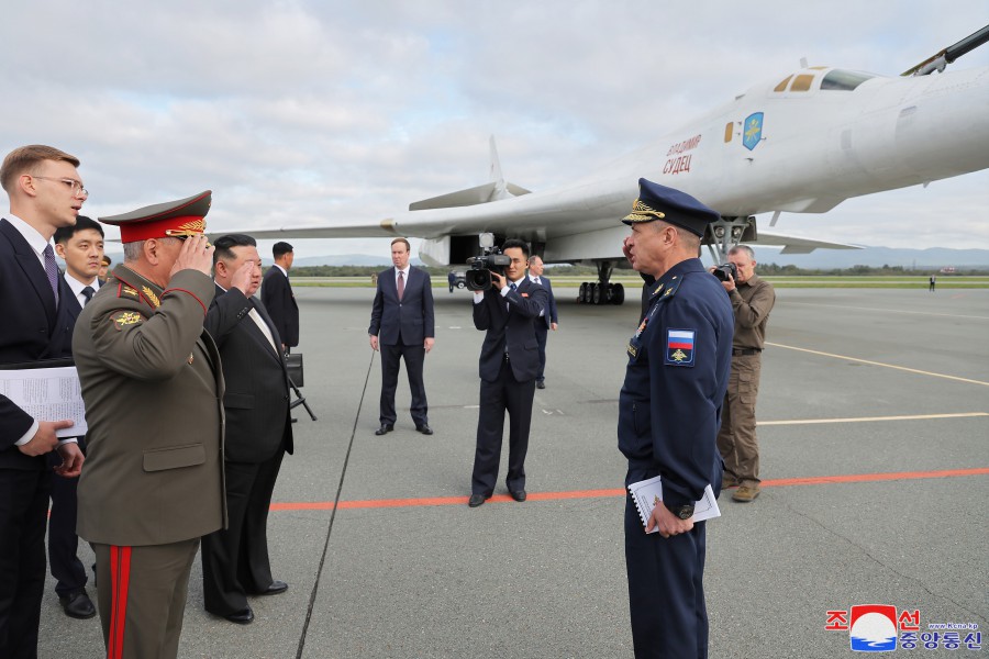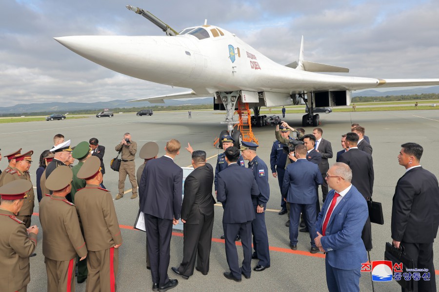 遠程航空兵司令謝爾蓋·科貝拉什熱烈歡迎金正恩同志訪(fǎng)問(wèn)克涅維奇軍用機場(chǎng),并具體介紹了展出的軍用飛機。
