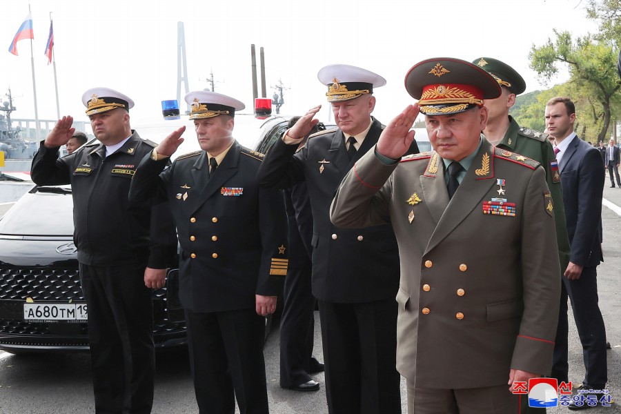 國防部長(cháng)謝爾蓋?紹伊古在午宴席上致辭時(shí)再次熱烈歡迎敬愛(ài)的金正恩同志訪(fǎng)問(wèn)俄羅斯聯(lián)邦和太平洋艦隊,并表示愿進(jìn)一步深化兩國國防省之間的友好與合作。