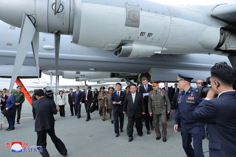 敬愛(ài)的金正恩同志同前來(lái)迎接的俄羅斯聯(lián)邦國防部副部長(cháng)阿列克謝?克里沃魯奇科、海軍總司令尼古拉·葉夫梅諾夫、遠程航空兵司令謝爾蓋·科貝拉什等軍隊指揮人員互致問(wèn)候后,參觀(guān)了各種戰略轟炸機和多用途戰斗機、殲擊機、襲擊機等俄羅斯空軍裝備的現代軍用飛機。
