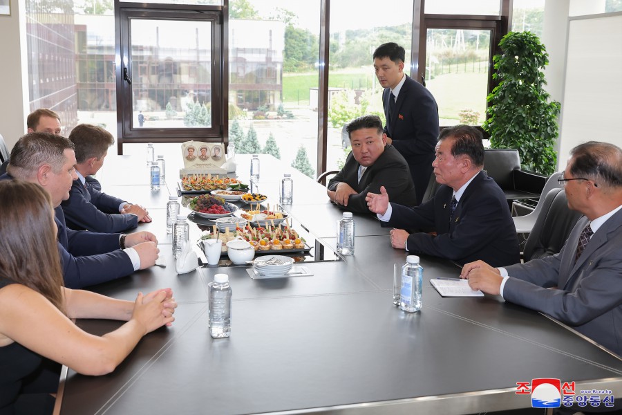敬愛(ài)的金正恩同志為紀念工廠(chǎng)訪(fǎng)問(wèn)同山金車(chē)生物飼料合成工廠(chǎng)有限責任公司總裁、總經(jīng)理和濱海邊疆區行政長(cháng)官合影。