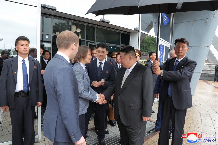 俄羅斯自然資源與生態(tài)部部長(cháng)亞歷山大·科茲洛夫、濱海邊疆區行政長(cháng)官奧列格?科熱米亞科和遠東聯(lián)邦大學(xué)校長(cháng)鮑里斯·科羅別茨迎接敬愛(ài)的金正恩同志。