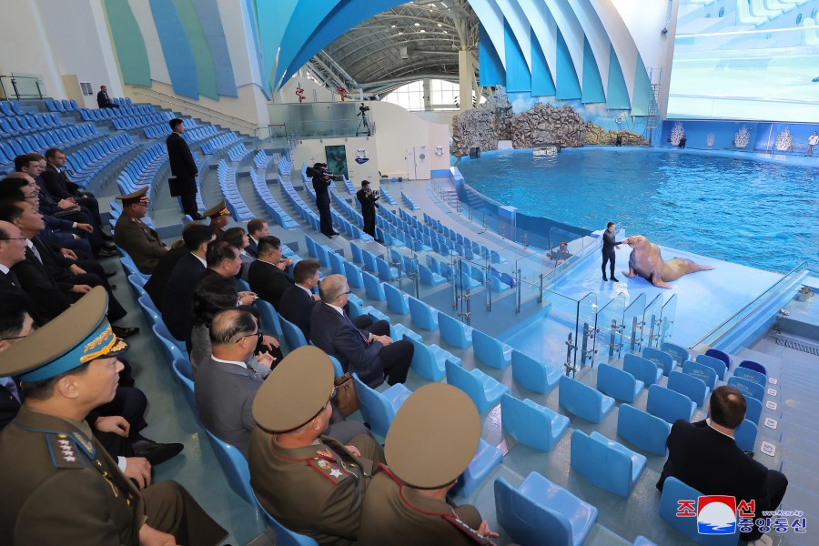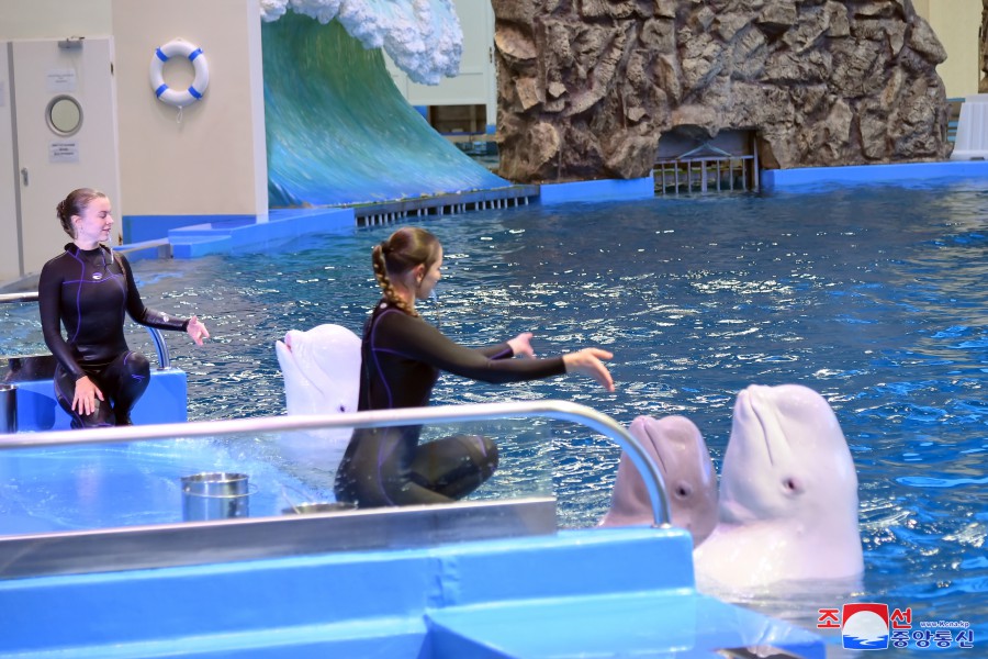 敬愛(ài)的金正恩同志來(lái)到海豚館觀(guān)看白海豚等海洋動(dòng)物的表演,并參觀(guān)了水族館各處。