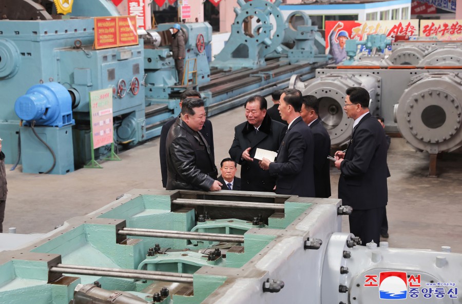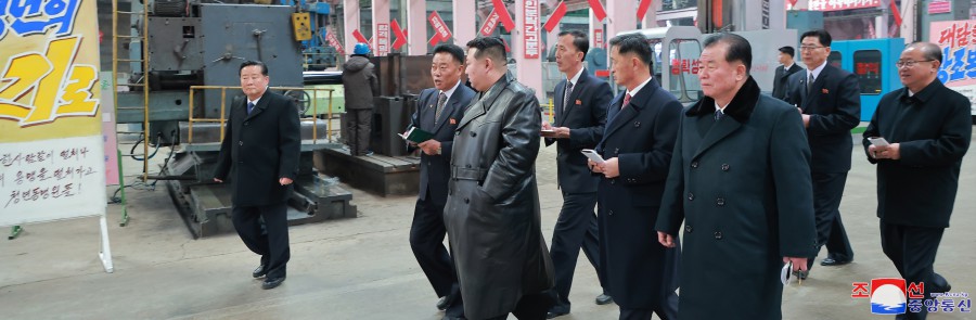 龍城機械聯(lián)合企業(yè)總經(jīng)理李京日、黨委會(huì )責任書(shū)記全仁哲陪同敬愛(ài)的金正恩同志。