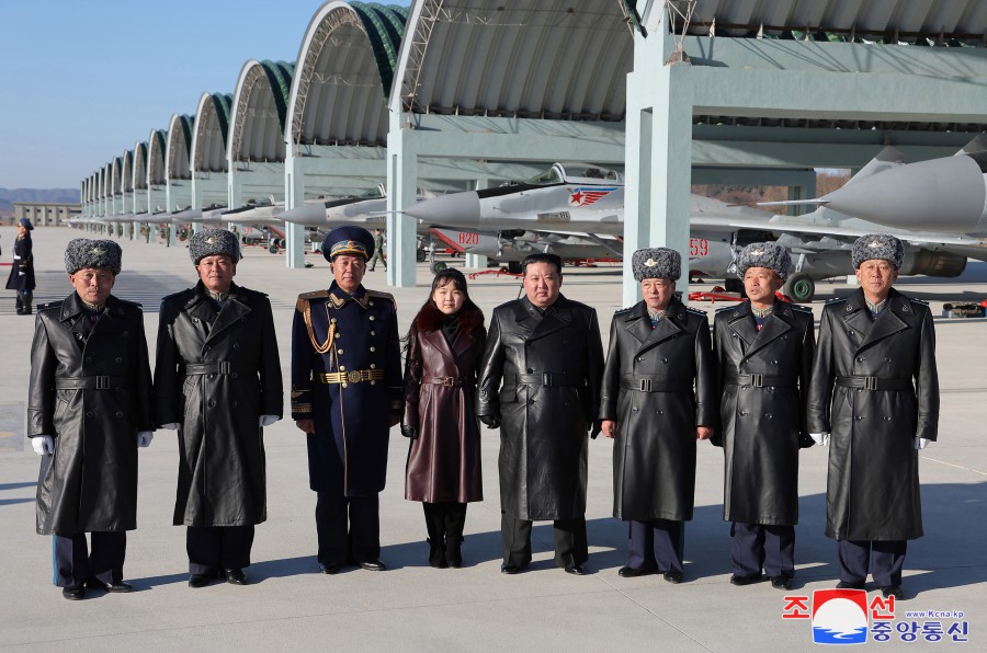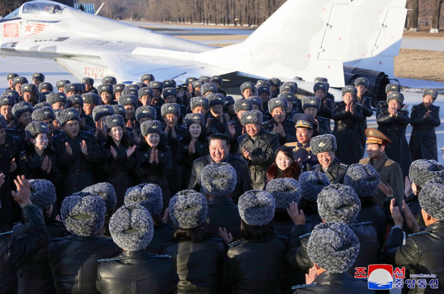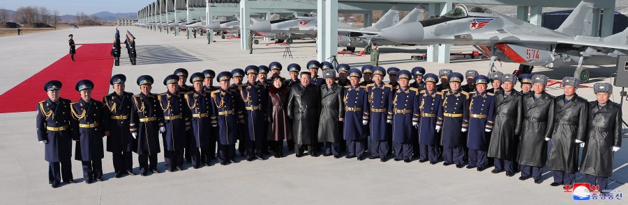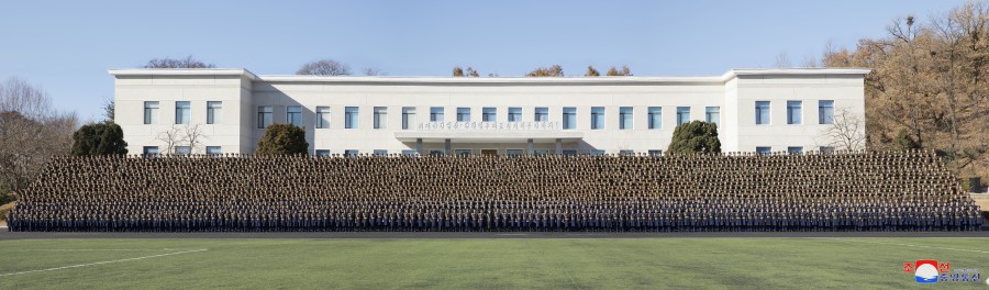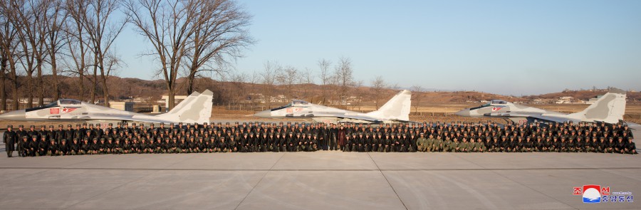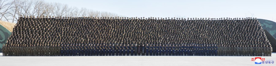 敬愛(ài)的金正恩同志參觀(guān)作戰指揮所和作戰方案研究室后,同朝鮮人民軍空軍司令部全體官兵合影留念,以紀念航空節。