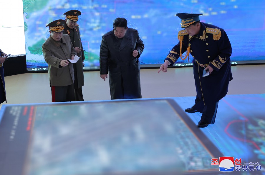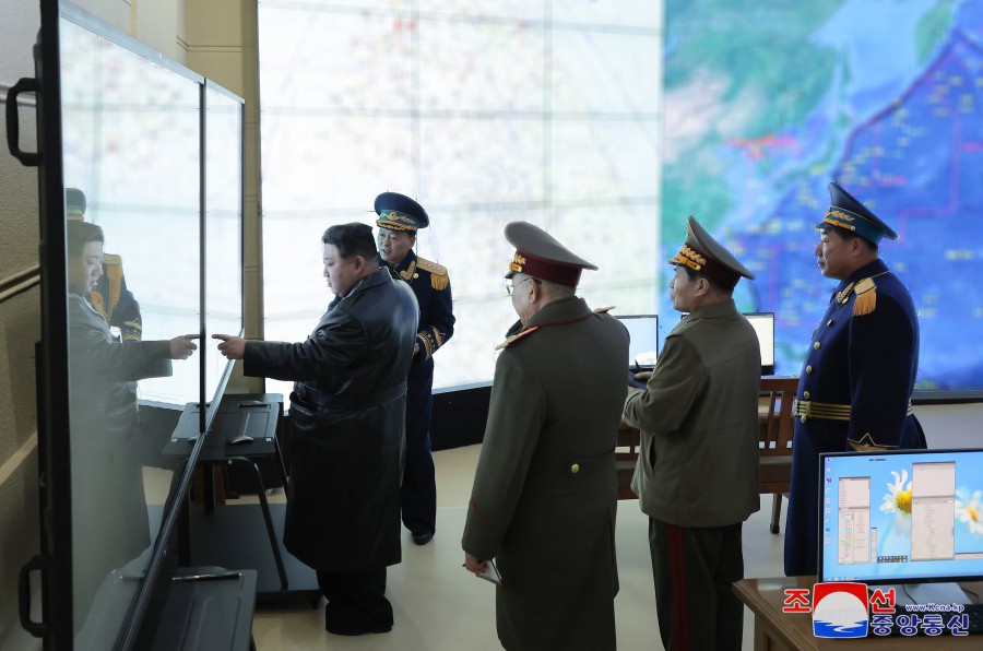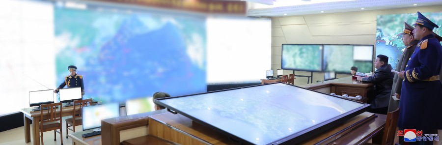 敬愛(ài)的金正恩同志在空軍司令官的陪同下參觀(guān)了作戰指揮所和作戰方案研究室。