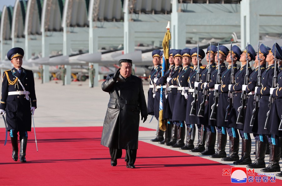 金正恩同志接到朝鮮人民軍空軍儀仗隊隊長(cháng)的迎接報告后,檢閱了空軍儀仗隊。