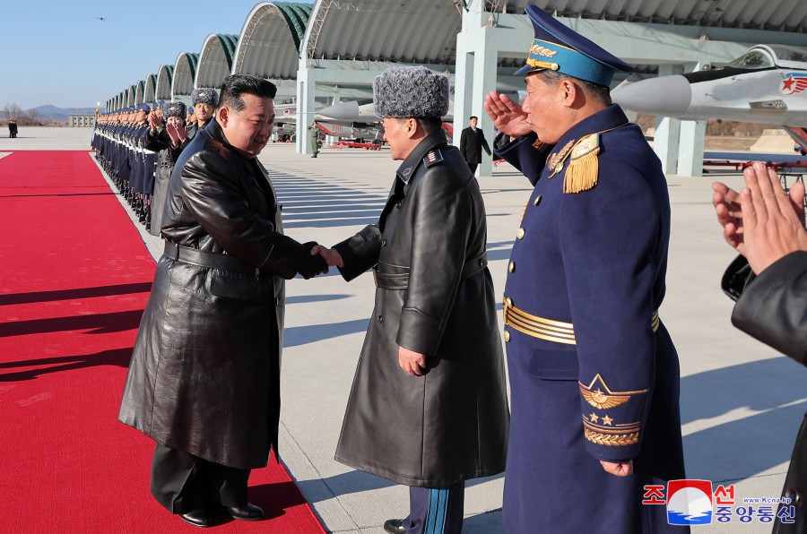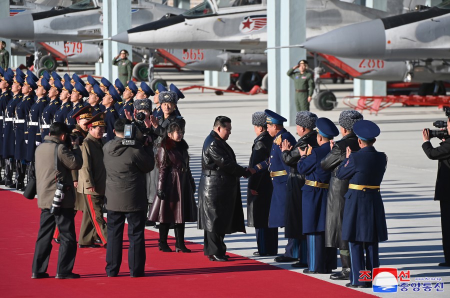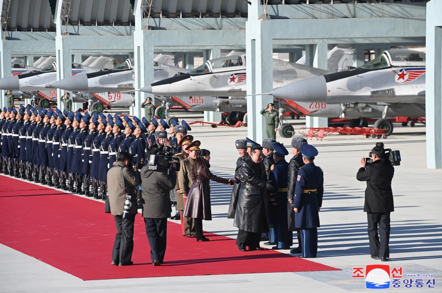 朝鮮人民軍空軍司令官金光赫空軍大將、政治委員嚴朱浩空軍中將等空軍司令部軍政指揮官心懷最火熱的敬慕之情迎接了敬愛(ài)的金正恩同志。