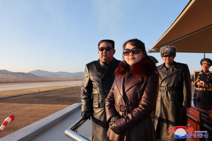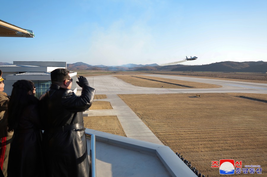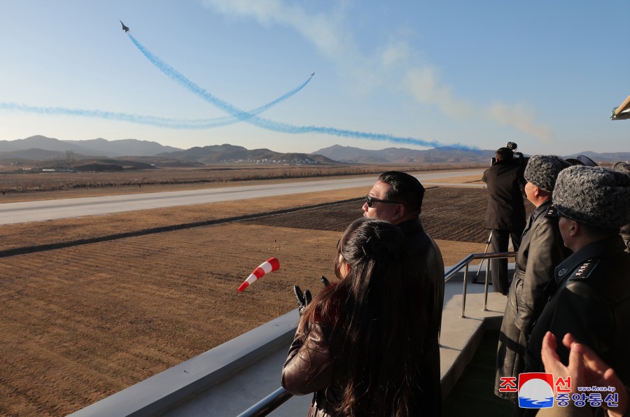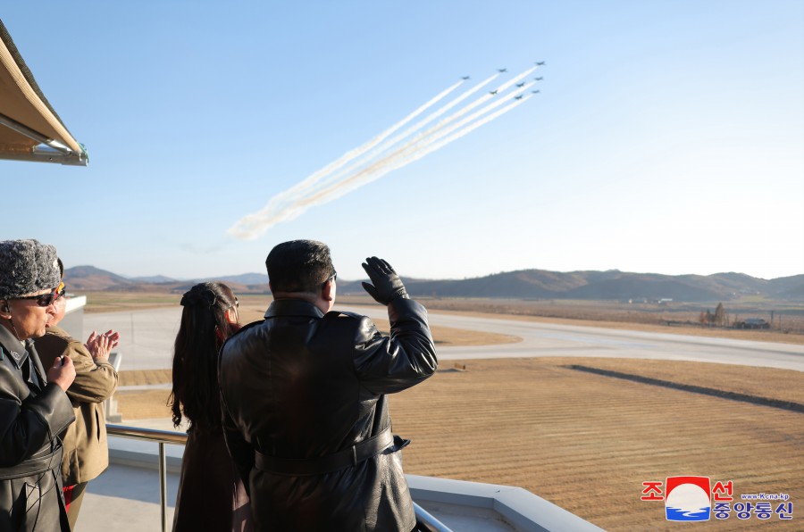 隨后,金正恩同志登上觀(guān)察所,觀(guān)摩了飛行員的示威飛行。