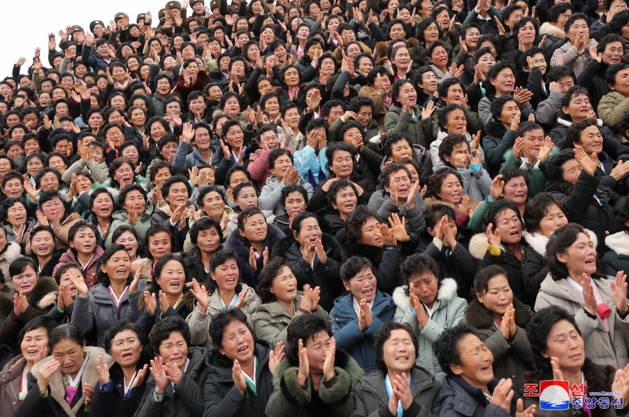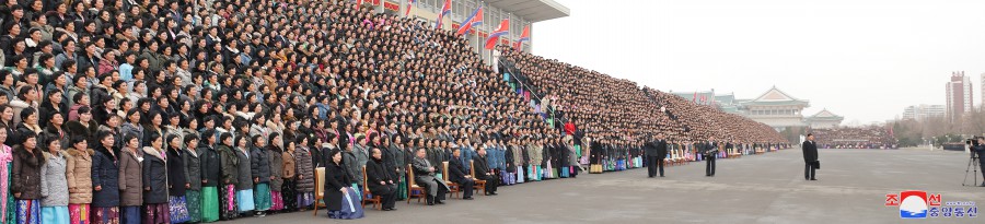 敬愛(ài)的金正恩同志抵達攝影場(chǎng)時(shí),全體與會(huì )者瞻仰社會(huì )主義大家庭的偉大慈父,爆發(fā)出了激情的歡呼聲,感激他安排舉行隆重盛會(huì )犒勞只不過(guò)盡了作為母親在家庭和社會(huì )面前應盡的責任和本分的她們,屢屢給予她們特別恩典。
