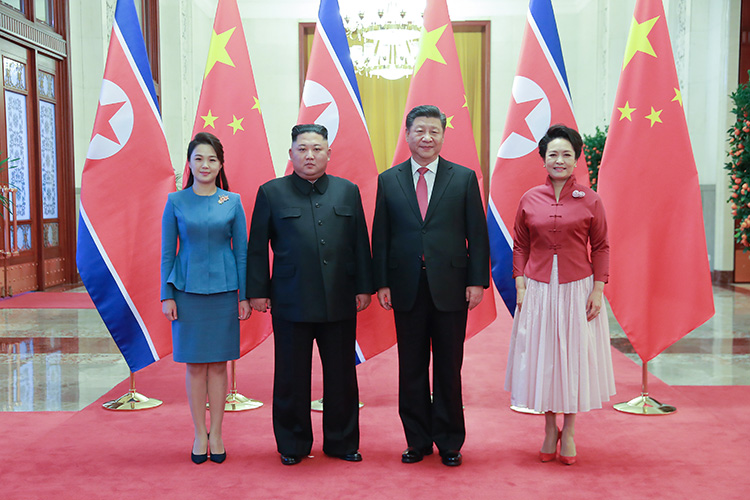 敬愛(ài)的金正恩同志和李雪主女士同習近平同志和彭麗媛女士合影留念。
