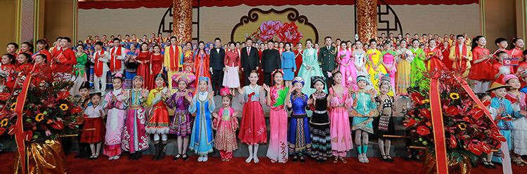 敬愛(ài)的金正恩同志向進(jìn)行出色演出的表演者表示感謝,并同他們合影。