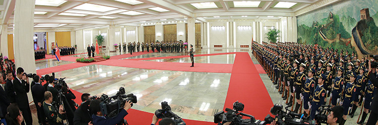 敬愛(ài)的金正恩同志檢閱中國人民解放軍三軍儀仗隊。