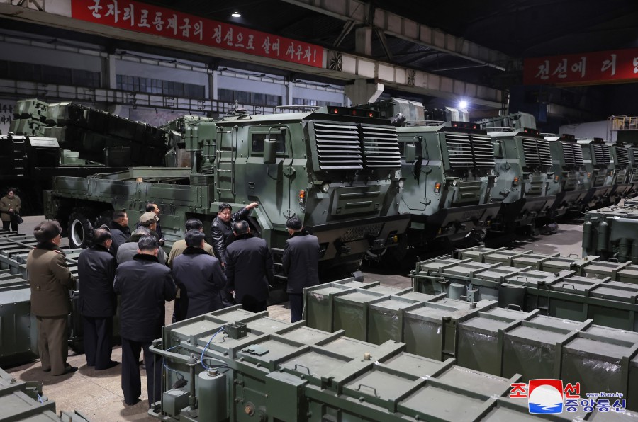 金正恩同志察看工廠(chǎng)各處,具體了解了武器戰斗技術(shù)器材生產(chǎn)情況。