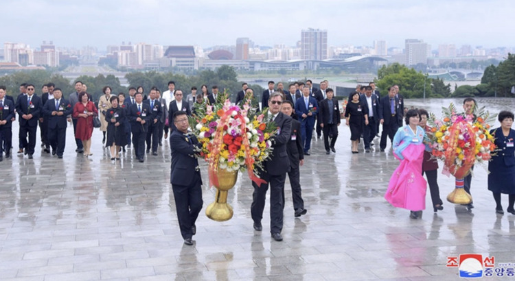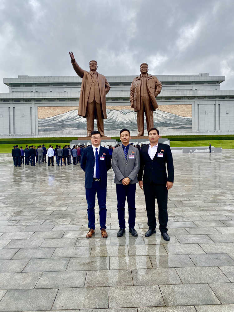 參加金日成金正日基金會(huì )第四次理事擴大會(huì )議的海外同胞及外國人向萬(wàn)壽臺兩大偉人銅像敬獻花籃!