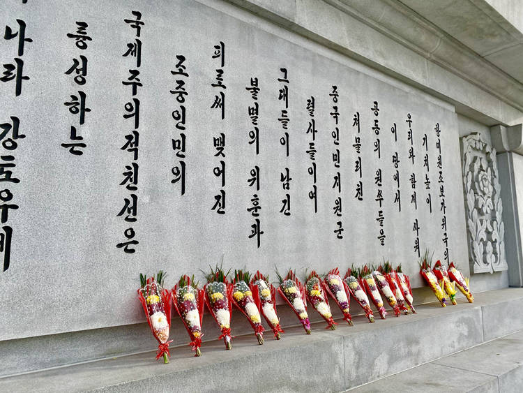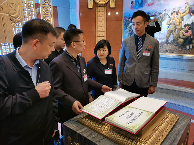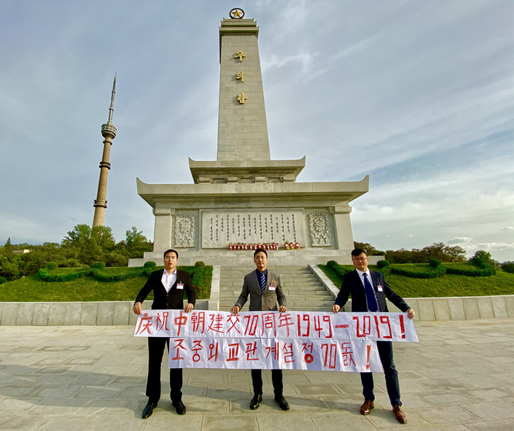 參加金日成金正日基金會(huì )第四次理事擴大會(huì )議的中國代表們,參謁中朝友誼塔!參謁的當天恰逢中朝建交70周年,在向紀念中國人民志愿軍烈士們的友誼塔獻花,并入塔瞻仰烈士名冊之后,在象征著(zhù)中朝兩國牢不可破關(guān)系的友誼塔前,我們舉起手寫(xiě)的“慶祝中朝建交70周年1949-2019!”中朝雙語(yǔ)條幅,并高呼,中朝友誼,世代相傳,萬(wàn)古長(cháng)青!