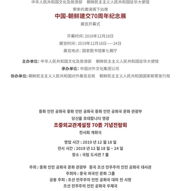 2019年,是中華人民共和國成立70周年,同時(shí)也是“中朝建交七十周年”,《中朝文化交流協(xié)定》簽訂六十周年。展覽以歌頌中朝傳統友誼為主題,以圖書(shū)、圖片及郵票等形式反映了兩國老一輩領(lǐng)導人和革命家懷著(zhù)共同的理想信念和深厚的革命友誼,彼此信賴(lài)、相互扶持,書(shū)寫(xiě)的一段歷史佳話(huà)。