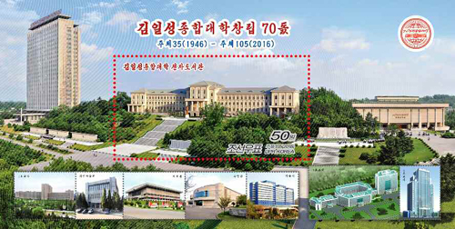 郵票上方均印有“金日成綜合大學(xué)建校70周年”“主體35(1946)-主體105(2016)”的字樣。