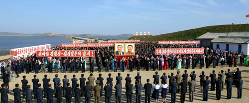 平安北道黨委委員長(cháng)金能五在致辭時(shí)表示,長(cháng)數十里的堤壩向茫茫大海伸展而產(chǎn)生4500町步海涂的現實(shí),是金日成同志、金正日同志和金正恩同志英明領(lǐng)導的結果。