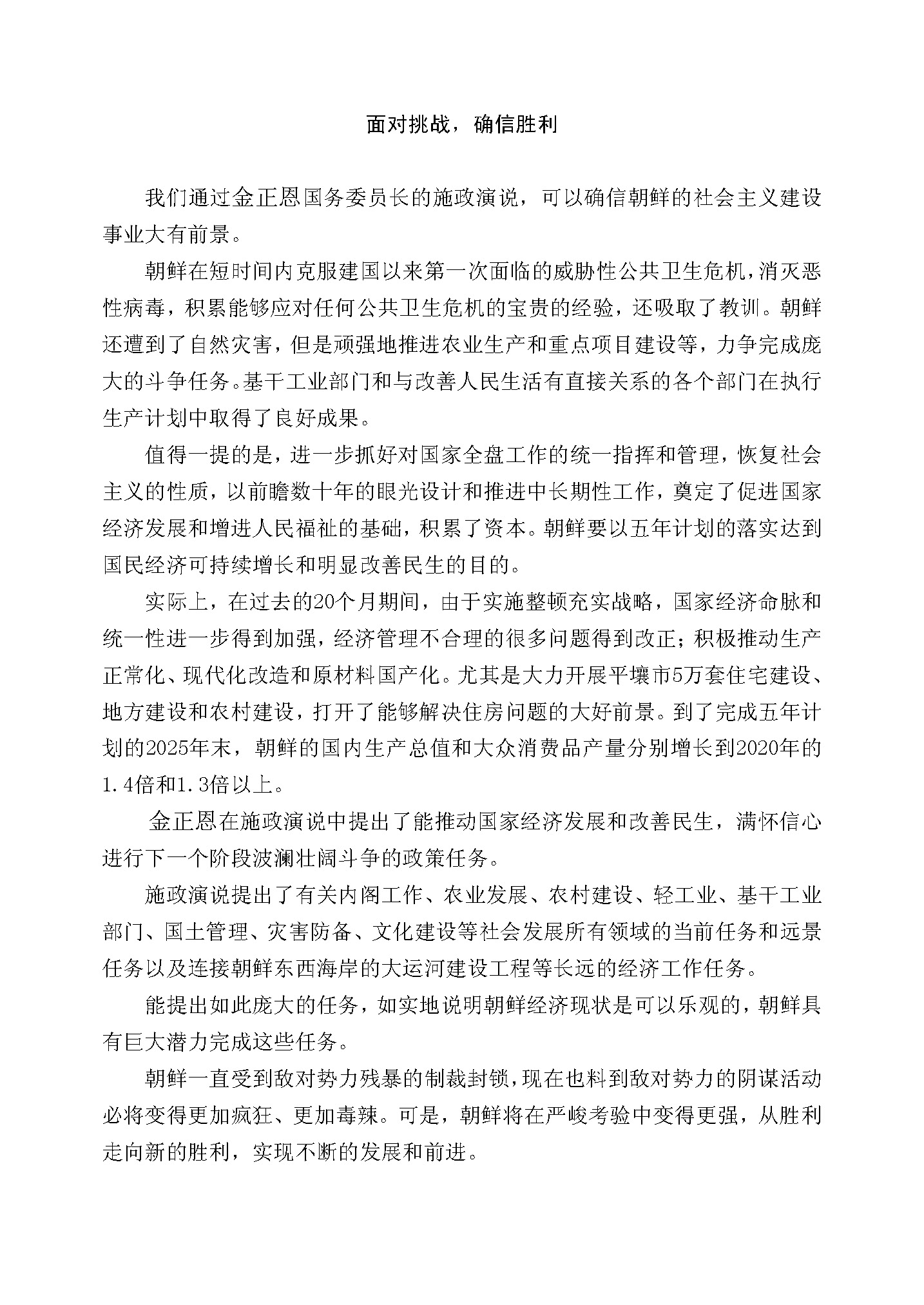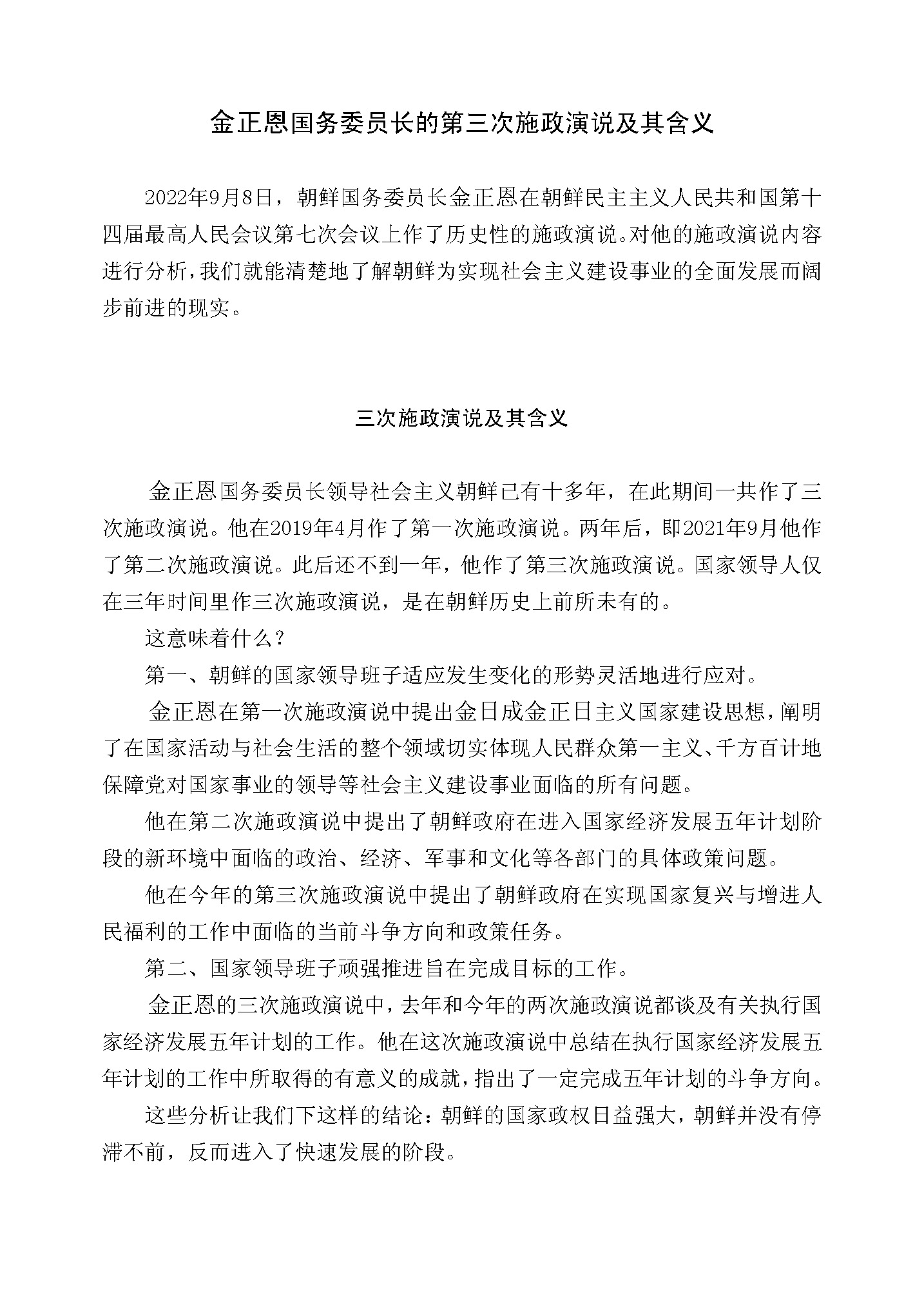 金正恩國務(wù)委員長(cháng)的第三次施政演說(shuō)及其含義