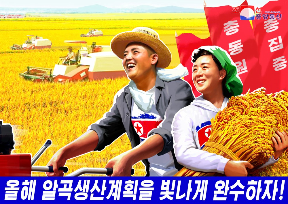 宣傳畫(huà)《勝利完成今年糧產(chǎn)計劃!》昭示堅決貫徹落實(shí)黨把攻占糧產(chǎn)目標提出為國民經(jīng)濟發(fā)展12個(gè)重要“高地”之第一個(gè)“高地”的意圖的思想。
