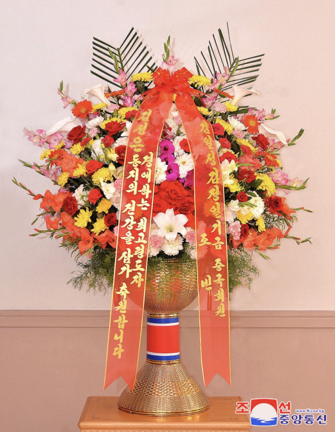 金日成金正日基金理事會(huì )成員向金正恩同志送來(lái)花籃